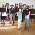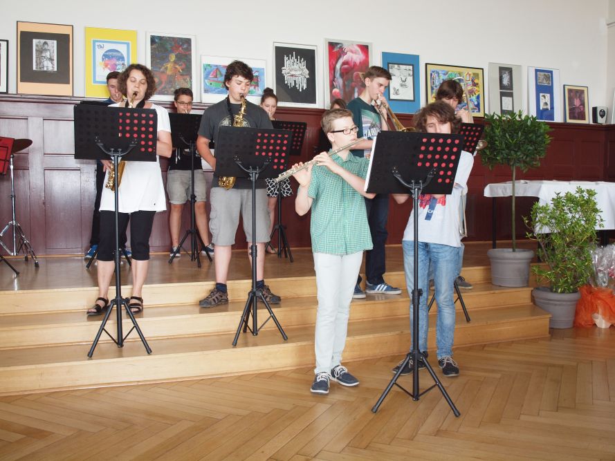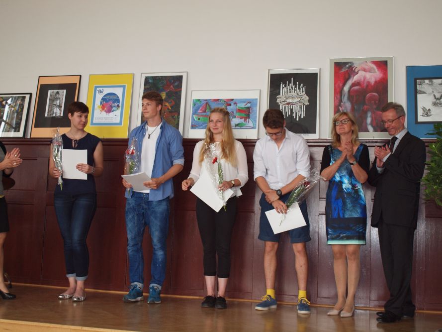 Es ist schon zur Tradition geworden, dass in Sachsen das Gymnasium Fanziskaneum Meißen Gastgeber zur Preisverleihung anlässlich dieses Wettbewerb ist. So hatten fleißige Hände die Schule am Sonnabend, dem 13. Juni 2015, wieder besonders herausgeputzt und man erwartete etwa 230 geladene Gäste. Nach der Begrüßung durch Schulleiterin Heike Zimmer, sprachen Bernd Gärtig, Abteilungsleiter in der Regionalstelle Dresden der Sächsischen Bildungsagentur, Andrea Dombois, Mitglied des Landtages, hier aber in ihrer Funktion als Präsidentin der Europäischen Bewegung Sachsens e.V., sowie Ronald Wilczek, Vorsitzender der sächsischen Landesjury des 62. Europäischen Wettbewerbs. Jeder von ihnen lobte die Kreativität aller Teilnehmer, die sich mit den altersgerecht abgestuften, aber doch anspruchsvollen Themen beschäftigt hatten, und die Vielfalt und Qualität der Ergebnisse. Gern hätte man alle Teilnehmer mit einem Preis geehrt. Da dies nicht möglich war, übernahmen die sächsische Landesjury bzw. für die Bundespreise die Bundesjury die schwere Aufgabe, die besten Arbeiten auszuwählen. Die meisten von ihnen werden im nächsten Jahr die Aula schmücken. Manche blieben allerdings gleich in Berlin, von wo aus sie in einer Wanderausstellung einem größeren Publikum zugänglich gemacht werden. 79 Landespreisträger und 24 Bundespreisträger (7 bzw. 3 von ihnen sind Schüler am Franziskaneum) wurden auf die Bühne der Aula gebeten, wo sie ihre Preise, Urkunden sowie einen kleinen Blumengruß überreicht bekamen. Bei so vielen Ehrungen verging die Zeit recht schnell. Die musikalische Umrahmung der Festveranstaltung übernahmen die Bigband, ein Gitarrenduo und eine Gesangssolistin des Franziskaneums unter der Leitung von Musiklehrerin Anett Kretzschmar. In den Händen von Silina Hirsch, Kunstlehrerin und Mitglied der Landesjury, lag die Hauptverantwortung für die Organisation dieser besonderen Veranstaltung. Herzlichen Dank dafür! Für die kulinarische Betreuung der aus ganz Sachsen angereisten Gäste danken wir dem Team der Menü GmbH Gröditz. Frisch gestärkt begaben sich zahlreiche Besucher der Preisverleihung anschließend in die Gassen Meißens, um beim Literaturfest dabei zu sein und sich unsere schöne historische Stadt anzusehen. Der 13. Juni 2015 – ein rundum gelungener Tag!