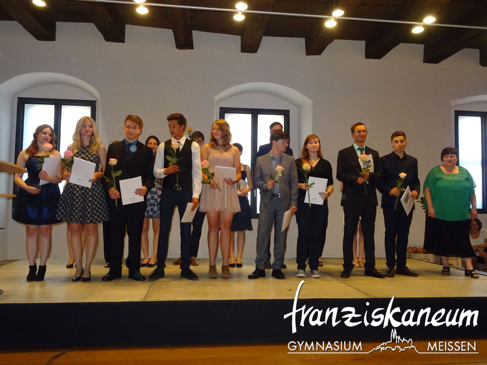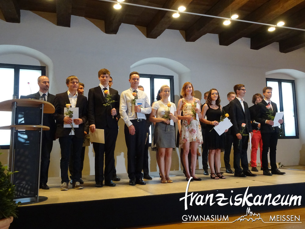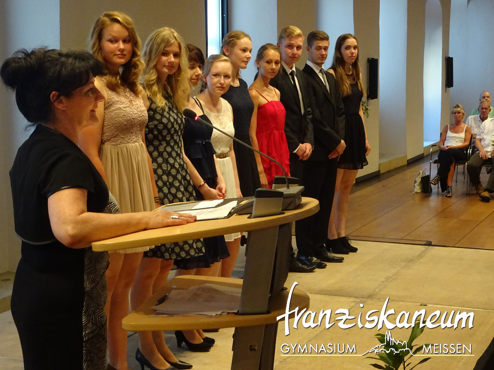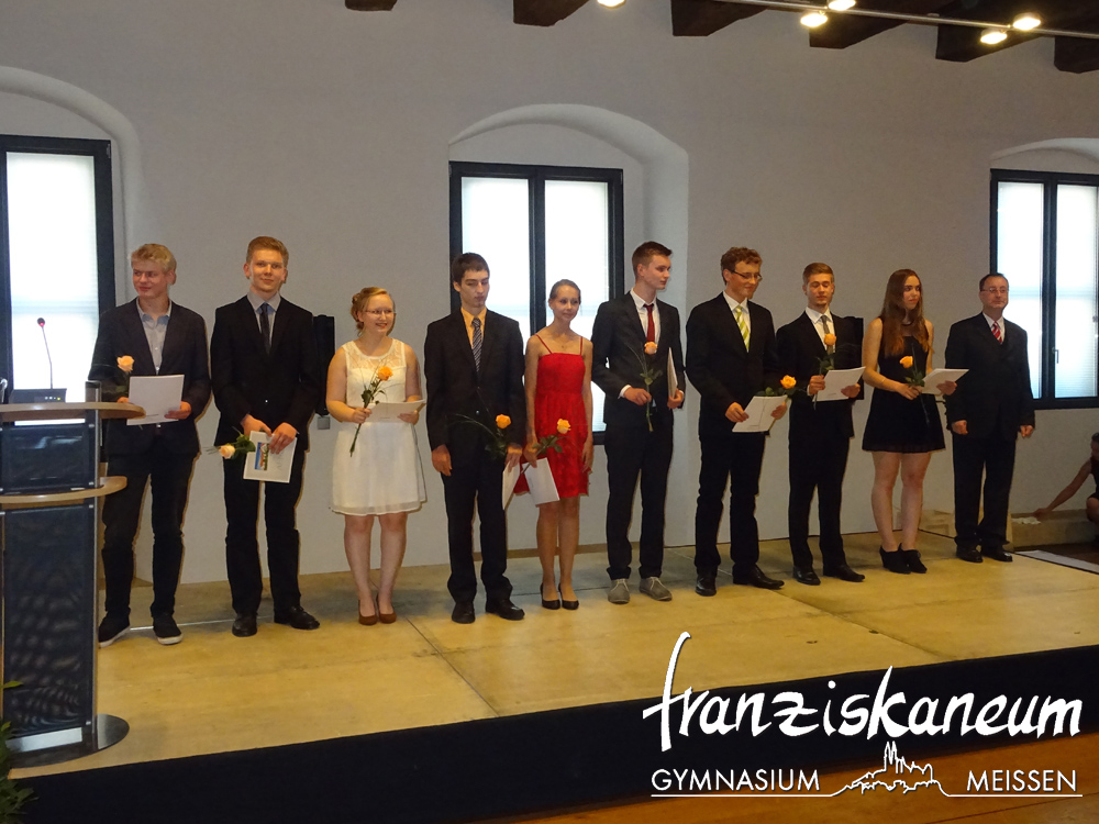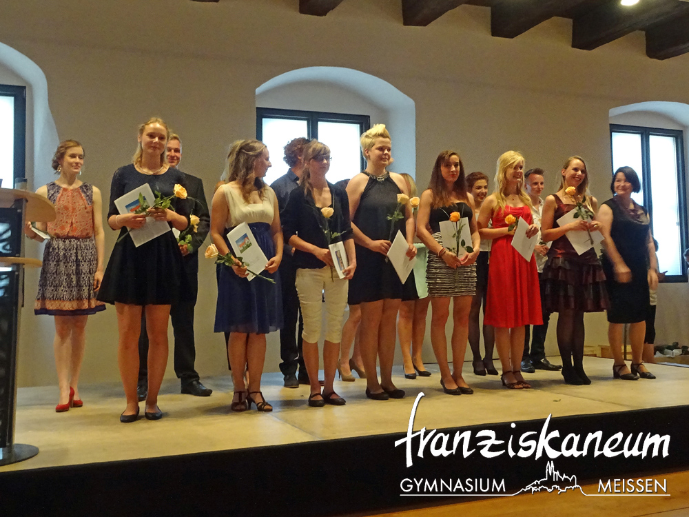Bei hochsommerlichen Temperaturen erhielten die Abiturienten des Jahrgangs 2015 am 02.07.2015 im Meißner Rathaus ihre Reifezeugnisse. Dabei konnte sogar ein Zeugnis mit der Traumnote 1,0 vergeben werden. Insgesamt erreichten 9 Schüler einen Abiturdurchschnitt von 1,5 und besser.