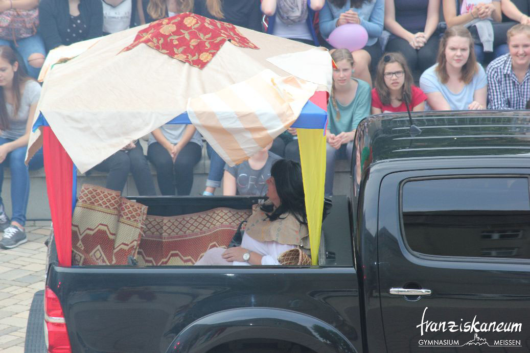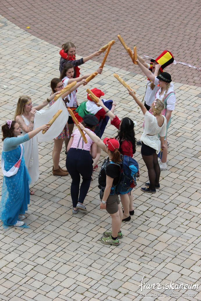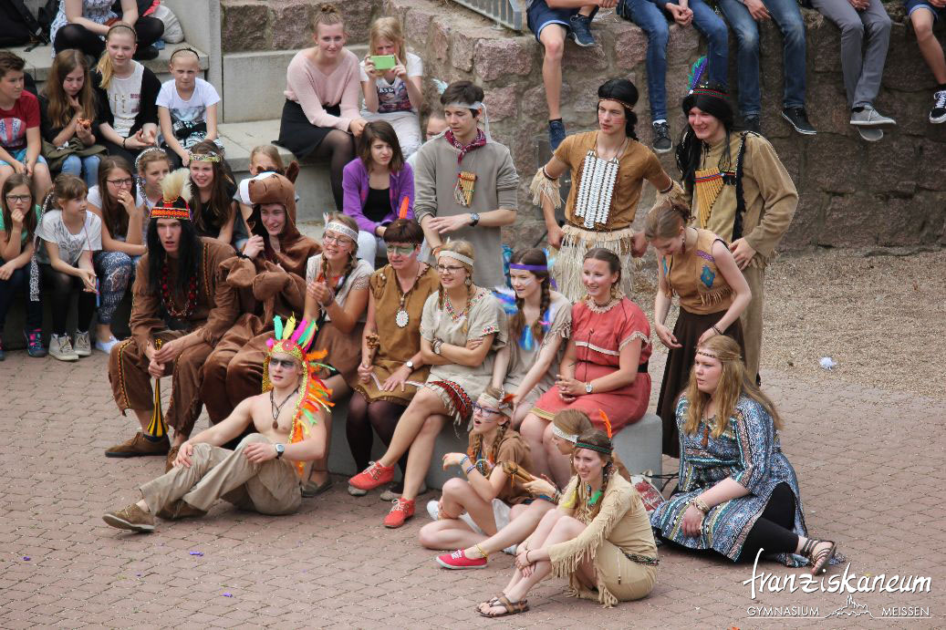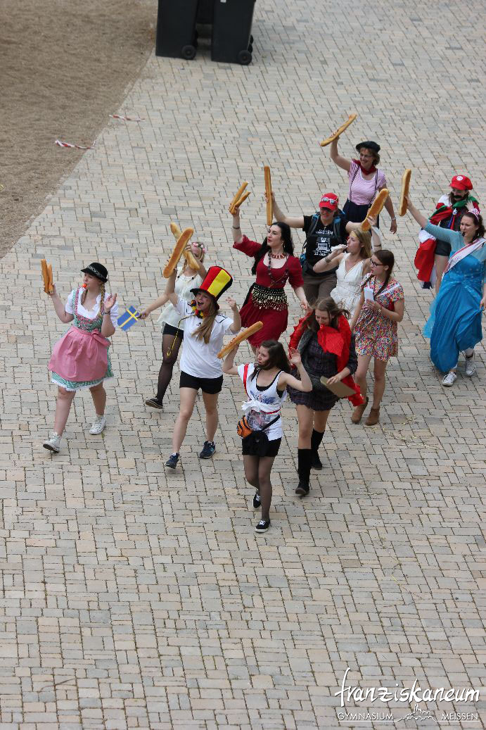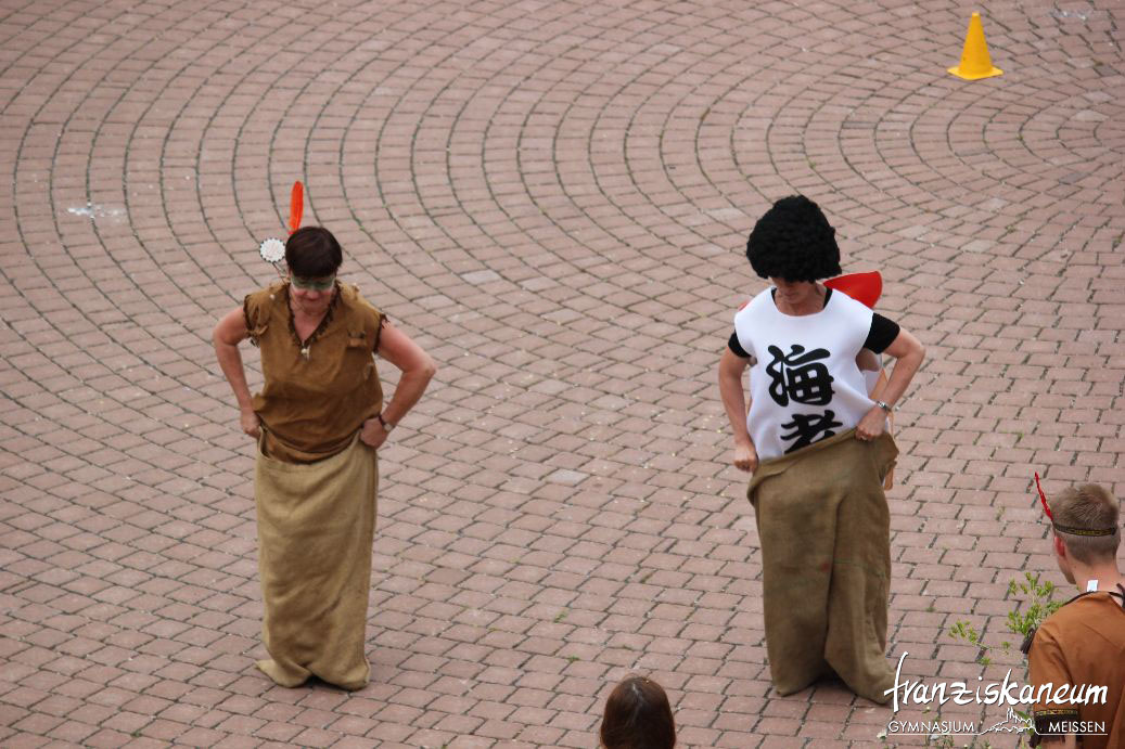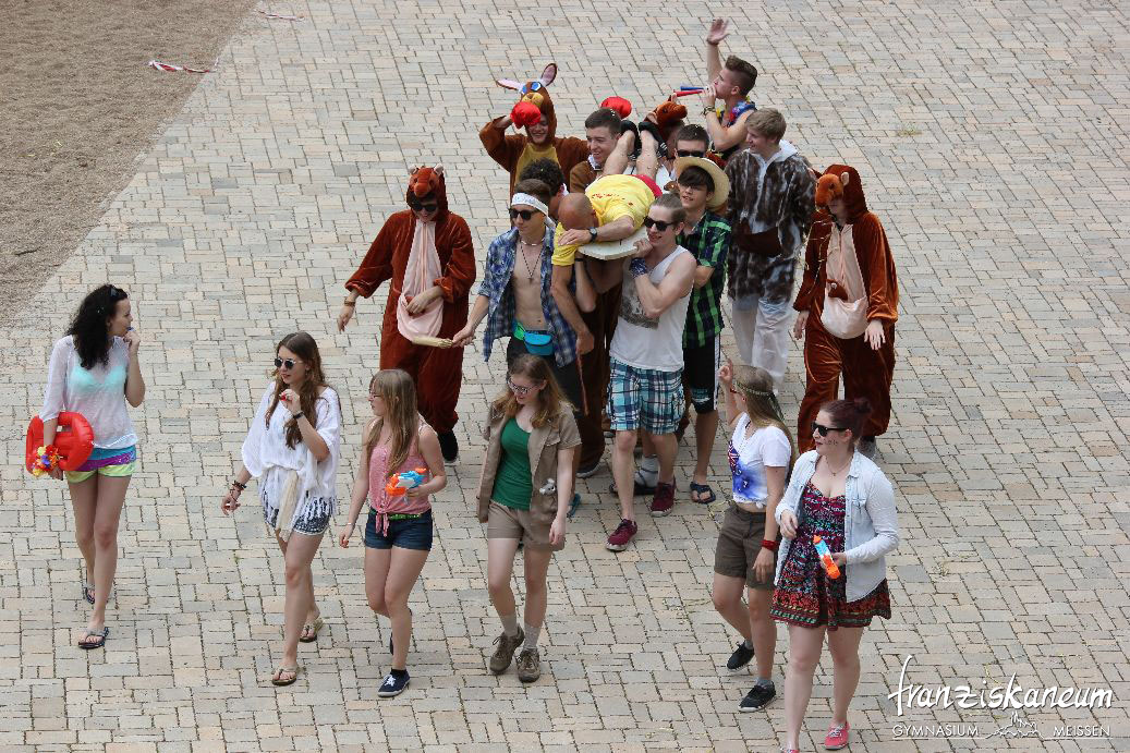 Ab Mittag folgte die große Abschlussfeier auf dem Schulhof und das aufwändig in Szene gesetzte Show-Programm. Natürlich konnten sich die Tutoren der Abschlussklassen wieder einmal nicht drücken und wurden von ihren Kursen kurzer Hand verkleidet. Dieses Jahr vertrat jeder Tutor-Kurs eine Nationalität. Es gab: Australien (LK Mathe, Tutor Herr Saalbach), Japan (LK Physik, Tutorin Frau Dr. Kutschker), „Die europäische Vielfältigkeit“ (LK Französisch, Tutorin Frau Müller), Ägypten (LK Geschichte, Tutorin Frau Baldauf), Amerika (LK Englisch, Tutorin Frau Rosch). Jede Nationalität stellte sich vor und war natürlich dem entsprechend gekleidet. Die Tutoren mussten ihre Kurse in einigen Wettkämpfen vertreten und sorgten so für eine allgemeine Erheiterung.