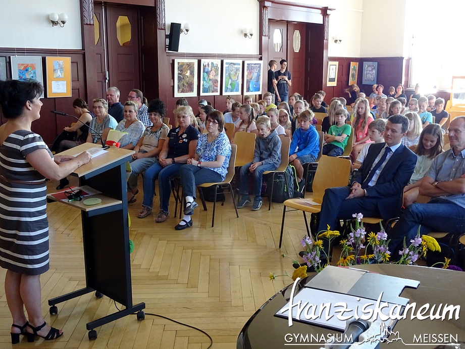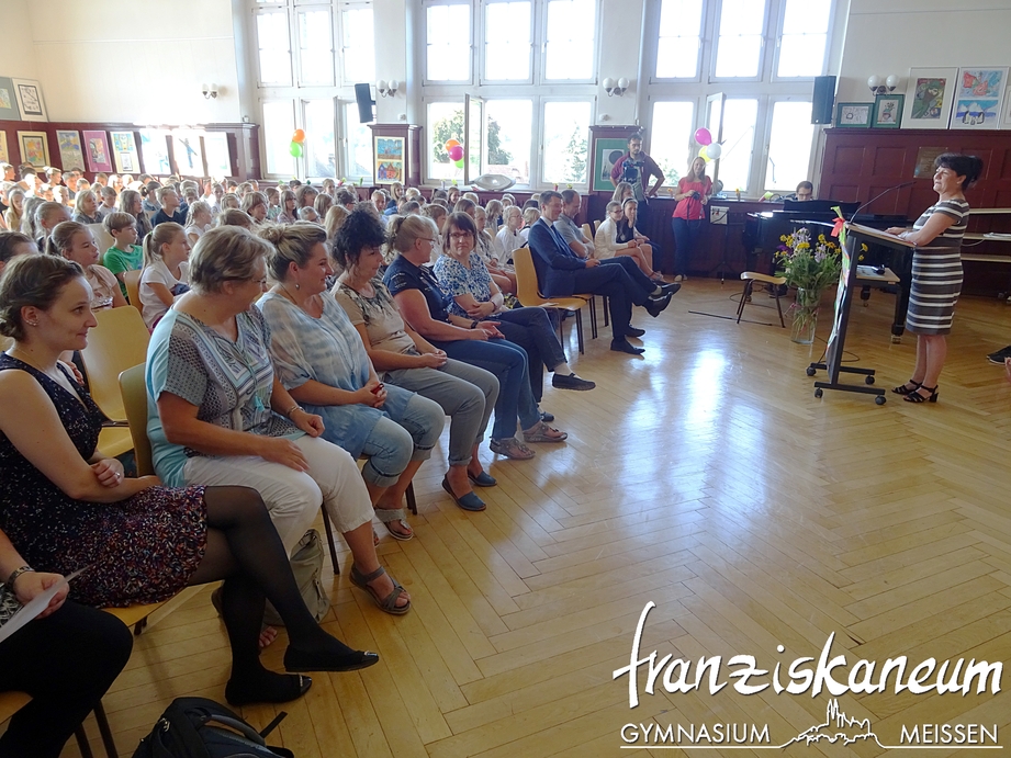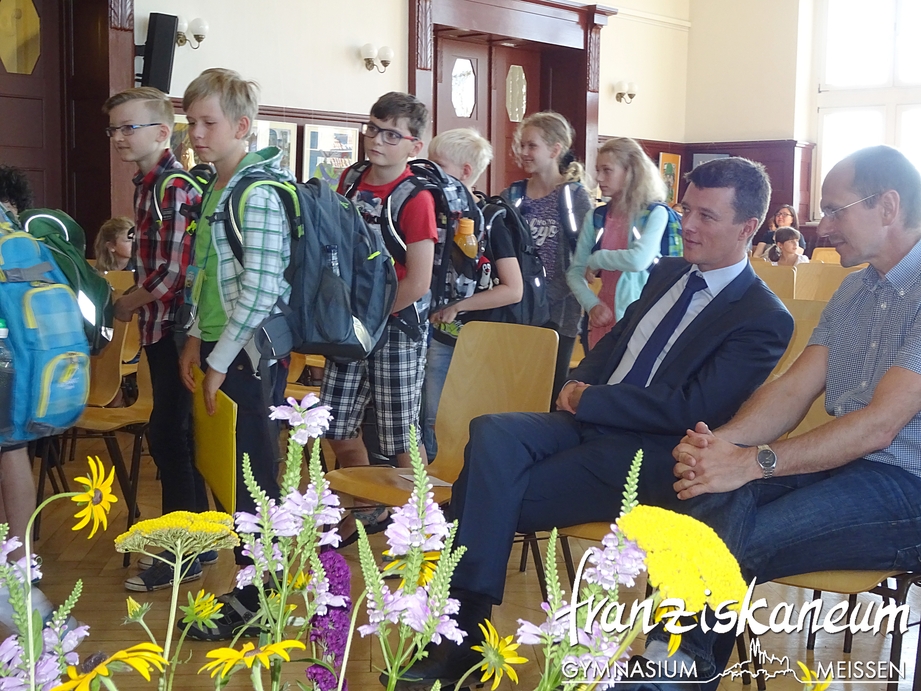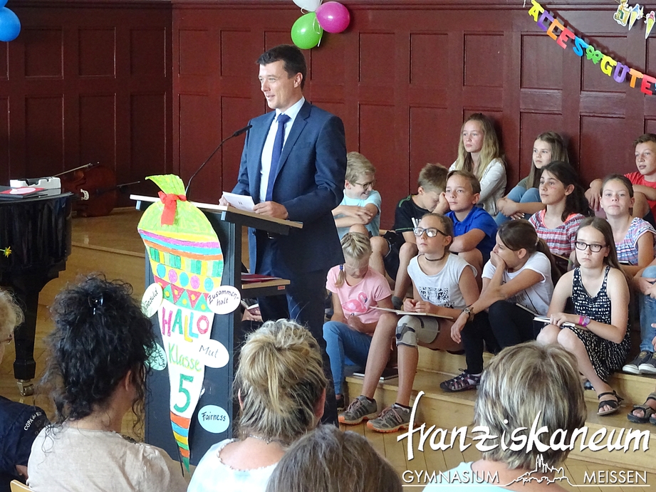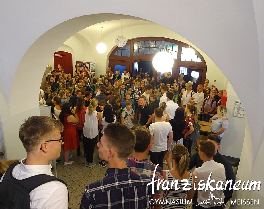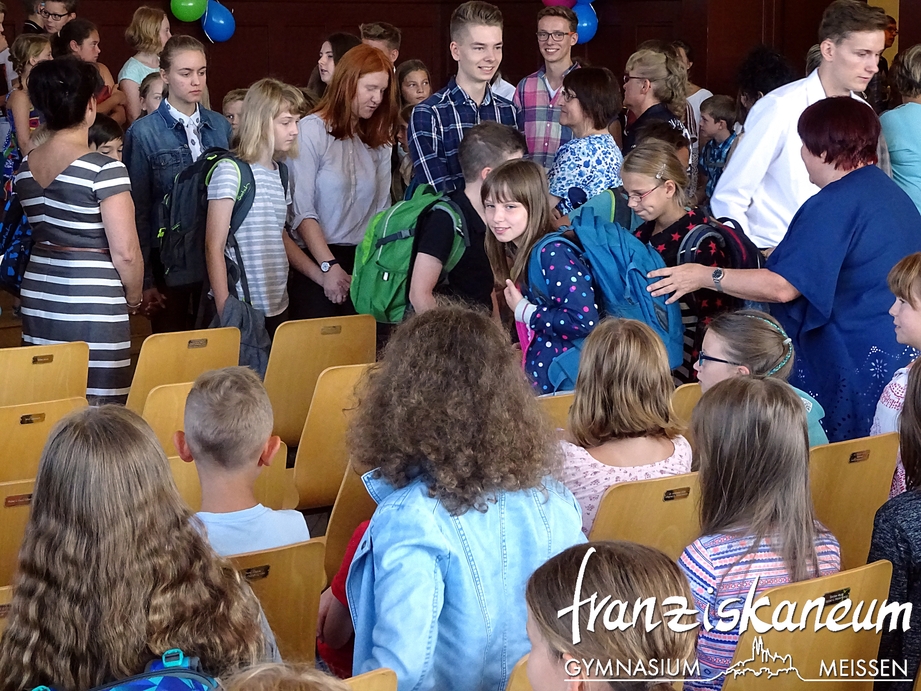 Traditionell wurden die neuen Franziskaner der Klassen 5/1 bis 5/5 am ersten Schultag an ihrer neuen großen schönen Schule begrüßt. Mit dem Abiturientenjahrgang 2017/18 zogen sie – begleitet von manchen Eltern – zur Auftaktveranstaltung in die Aula ein. Hier erwarteten sie die Schulleitung, Vertreter der Stadt, ihre neuen Klassenlehrer und ihre Patenklassen.