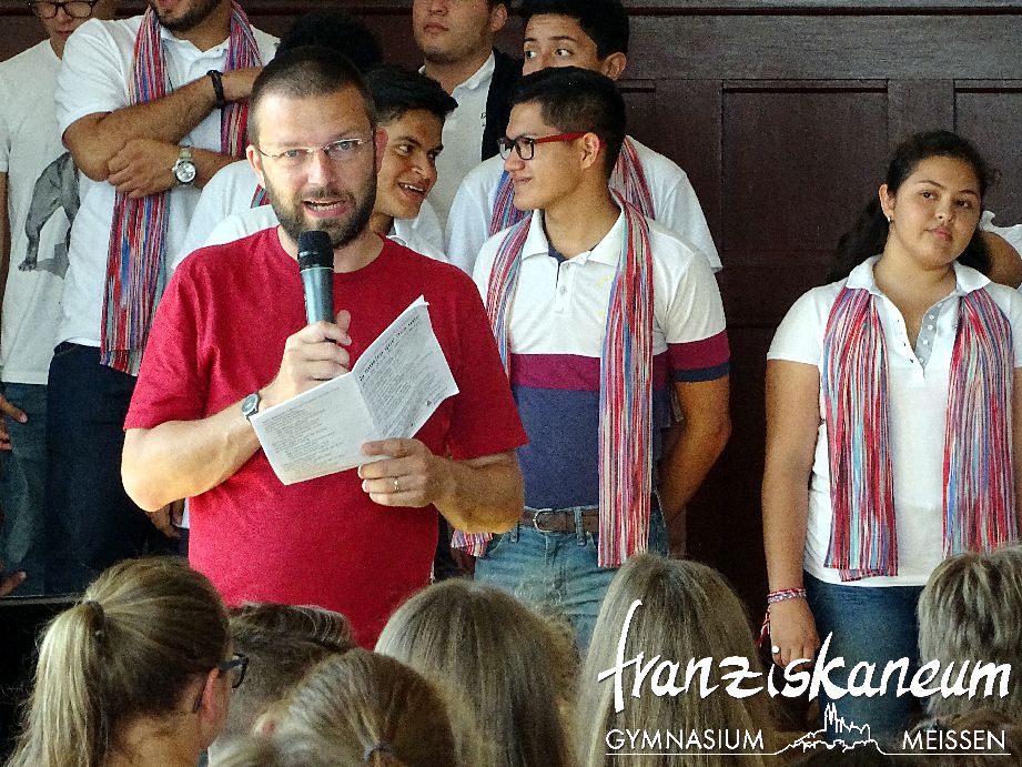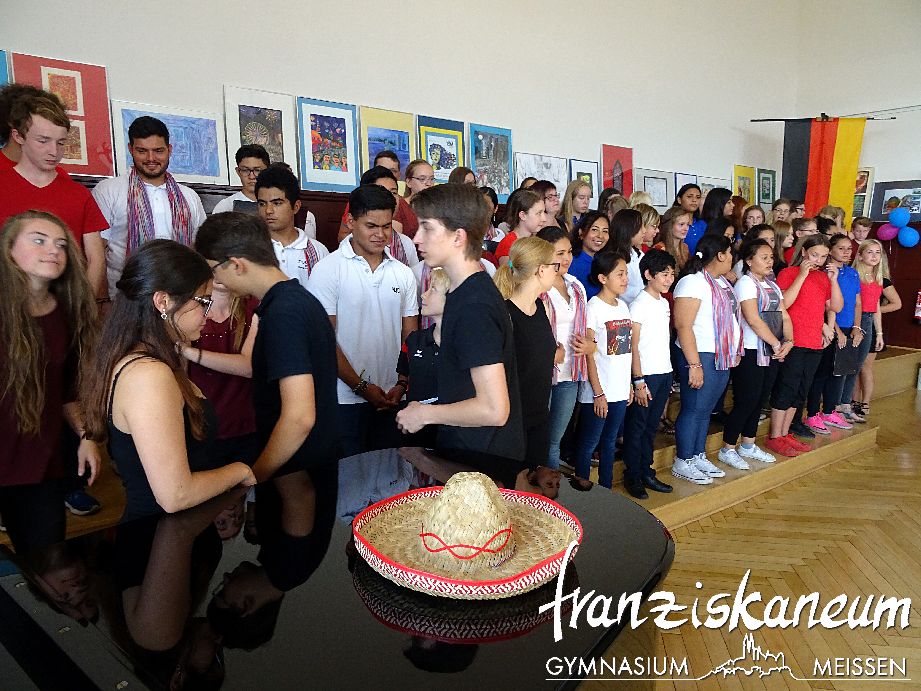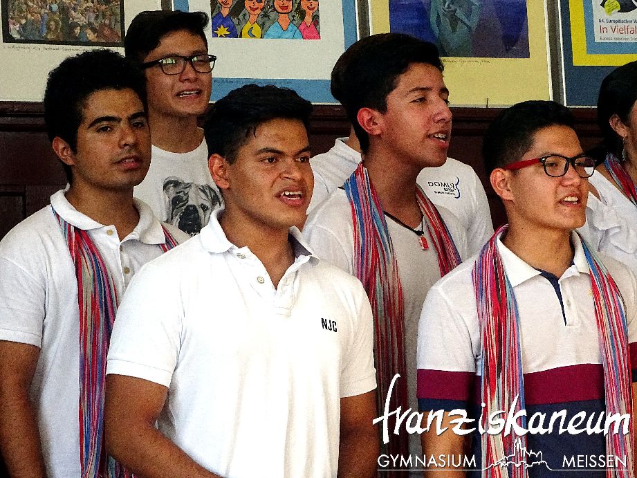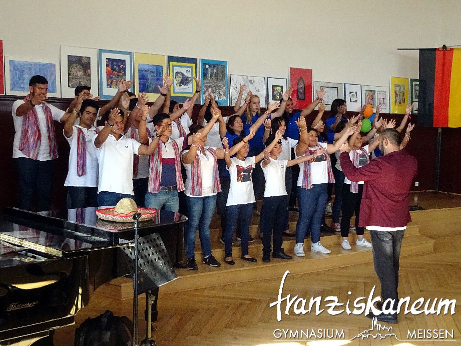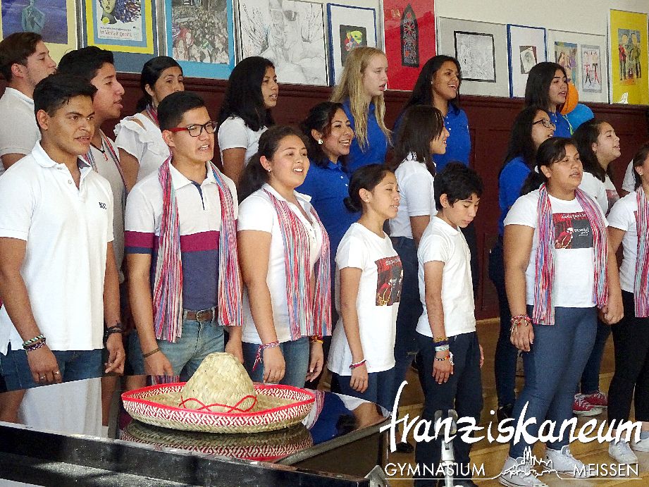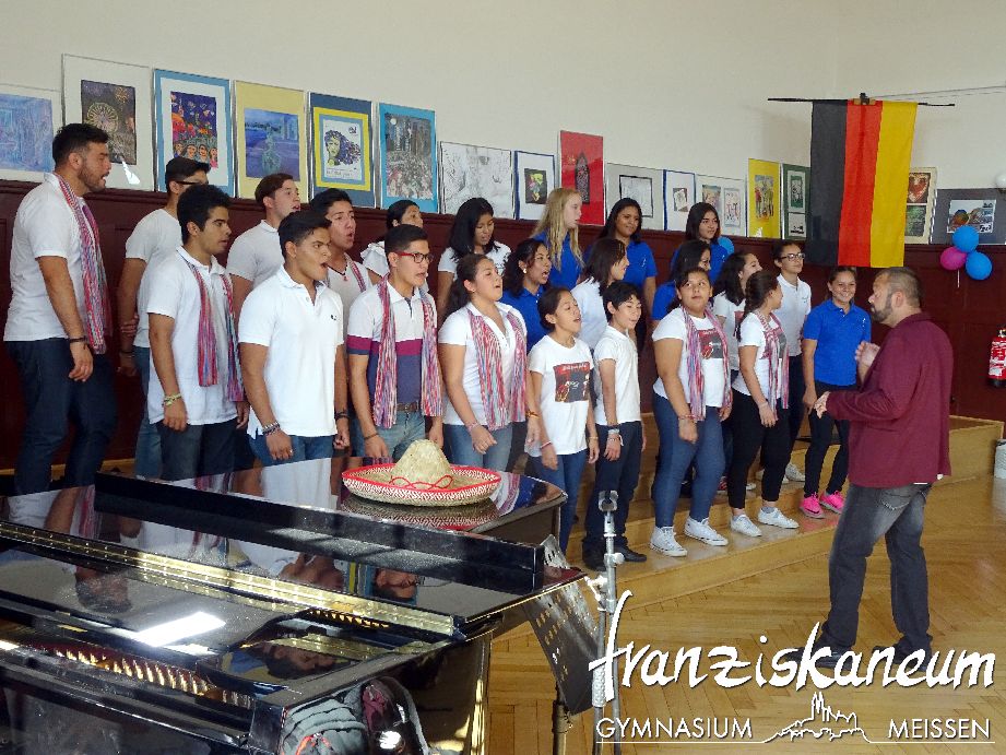 La música que nos une“ unter diesem Auftakt starteten wir nach den Sommerferien in das neue Schuljahr. Am 08.08.2017 besuchten uns am Franziskaneum der mexikanische Jugendchor „Domus Artis“ aus Chetumal/ Mexiko unter der Leitung von Gabriel Trujillo del Río sowie der Partnerjugendchor aus Großenhain-Reinersdorf-Ebersbach unter der Leitung von Stefan Jänke. Um 14.30 Uhr begann das Konzert für alle Spanisch-Profilschüler und Grundkursschüler der 11. und 12. Klassen sowie Lehrer und interessierte Zuhörer. Wir waren gespannt darauf, was uns an diesem Nachmittag erwarten würde. Zunächst begrüßten Henriette Künzelmann und Tanne Machner, Schülerinnen aus dem Grundkurs Spanisch Klasse 11, die Gäste auf Deutsch und Spanisch.