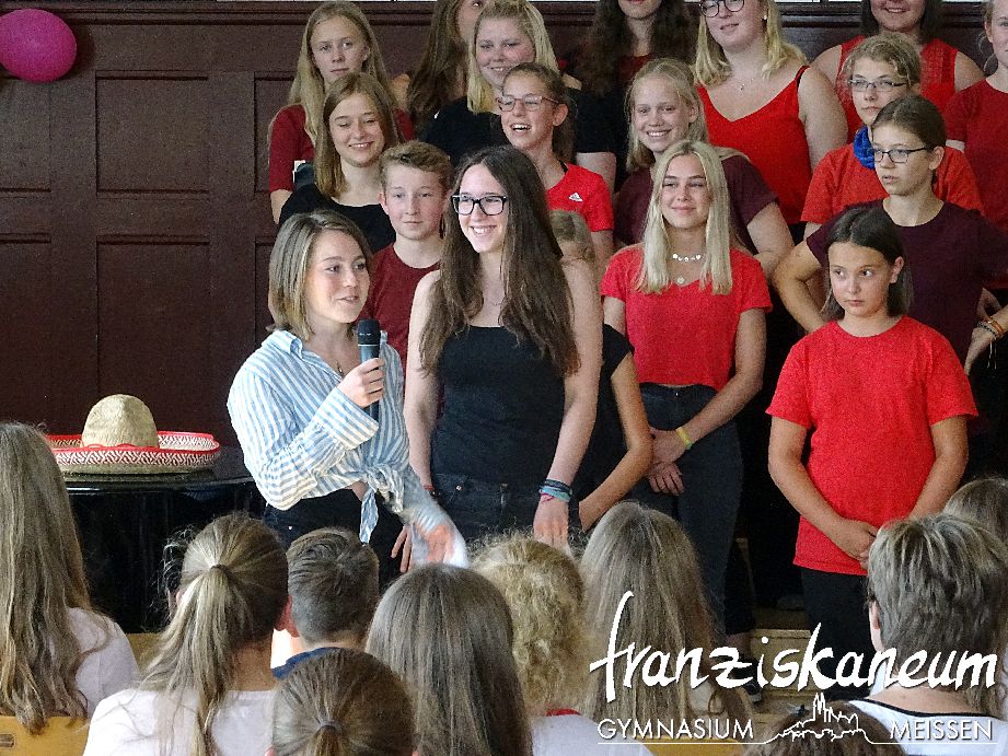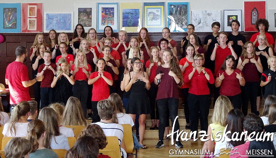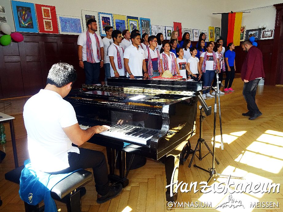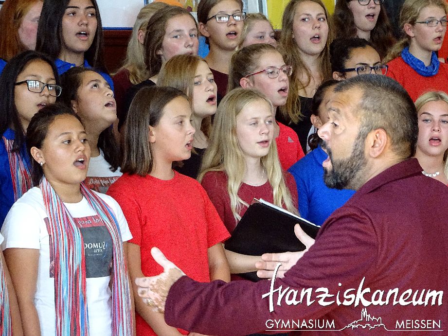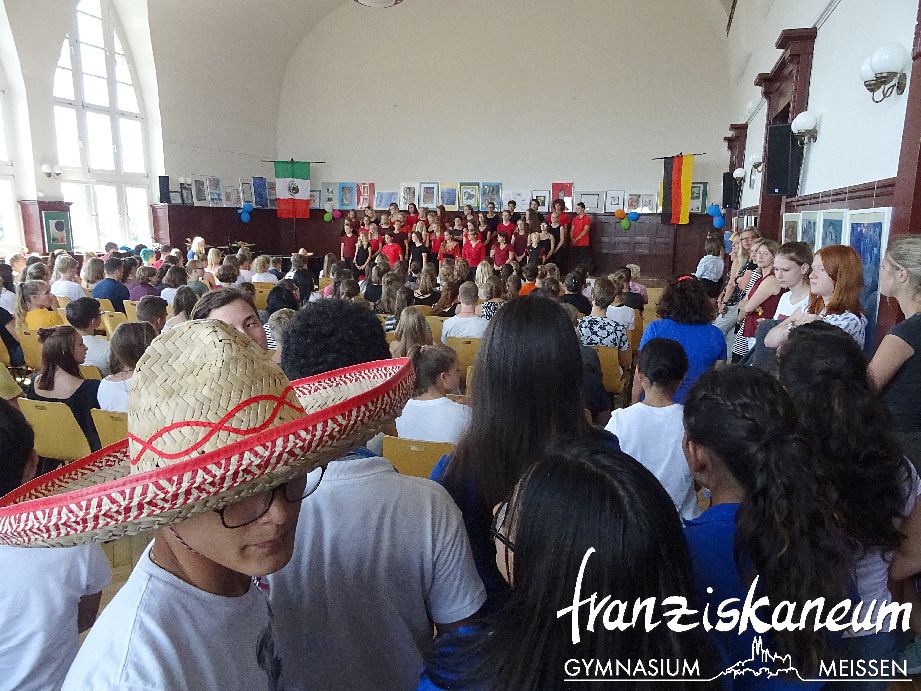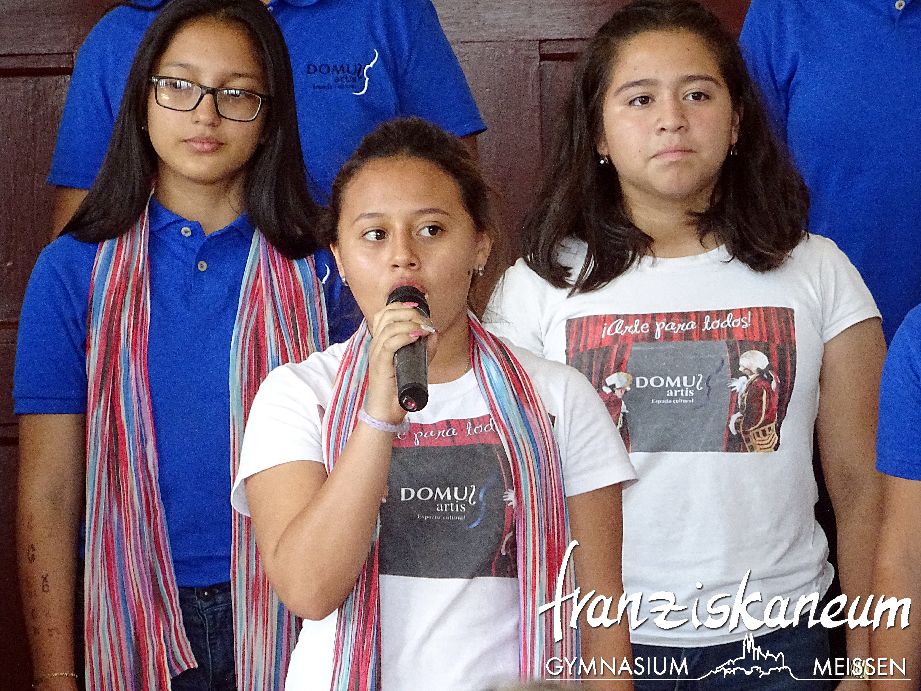 La música que nos une“ unter diesem Auftakt starteten wir nach den Sommerferien in das neue Schuljahr. Am 08.08.2017 besuchten uns am Franziskaneum der mexikanische Jugendchor „Domus Artis“ aus Chetumal/ Mexiko unter der Leitung von Gabriel Trujillo del Río sowie der Partnerjugendchor aus Großenhain-Reinersdorf-Ebersbach unter der Leitung von Stefan Jänke. Um 14.30 Uhr begann das Konzert für alle Spanisch-Profilschüler und Grundkursschüler der 11. und 12. Klassen sowie Lehrer und interessierte Zuhörer. Wir waren gespannt darauf, was uns an diesem Nachmittag erwarten würde. Zunächst begrüßten Henriette Künzelmann und Tanne Machner, Schülerinnen aus dem Grundkurs Spanisch Klasse 11, die Gäste auf Deutsch und Spanisch.