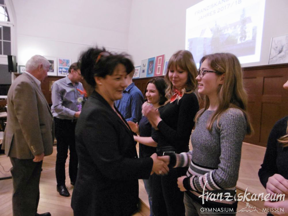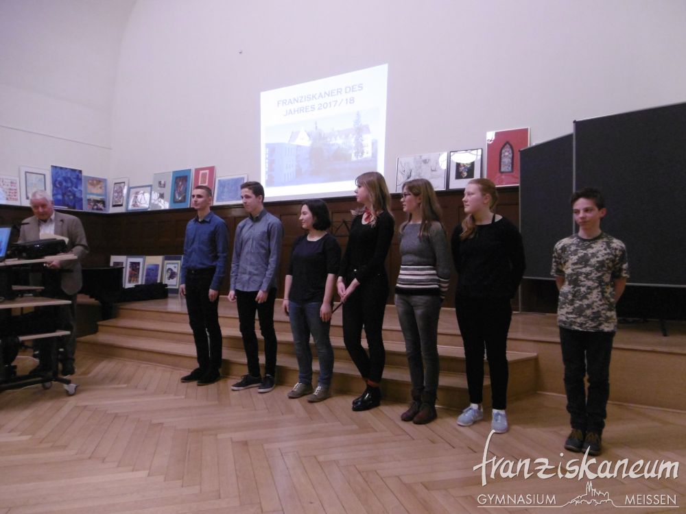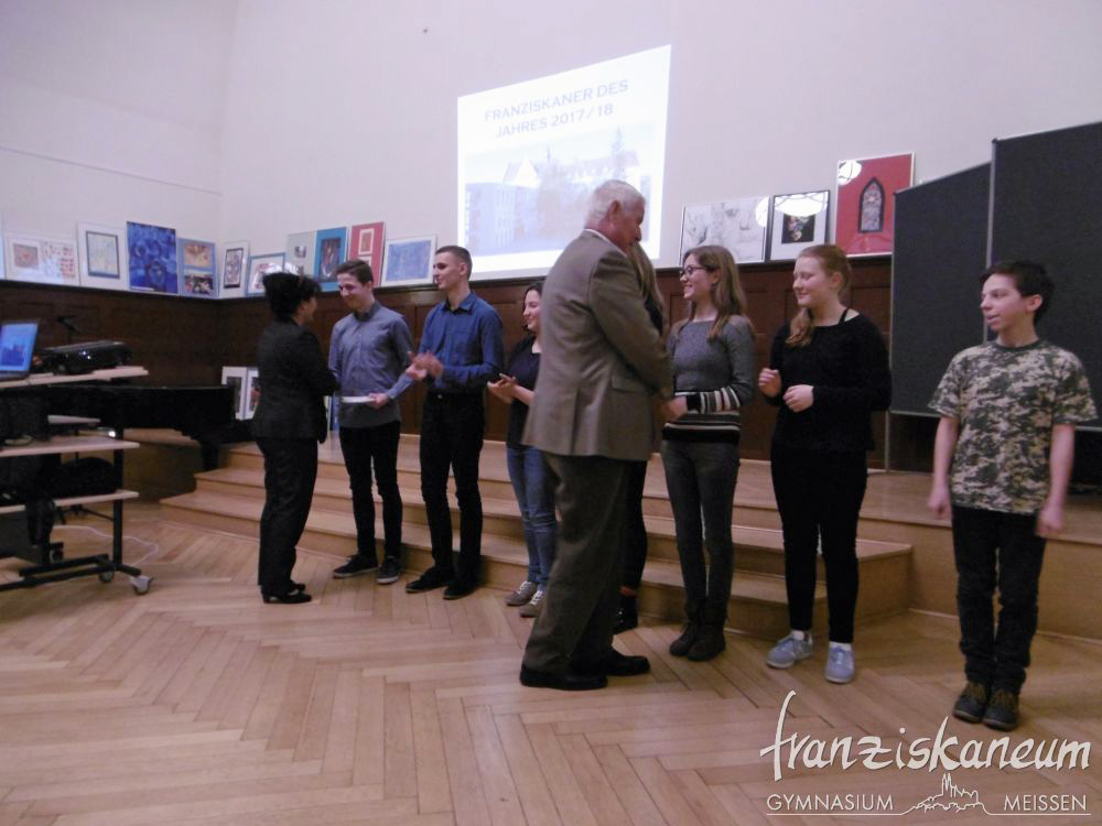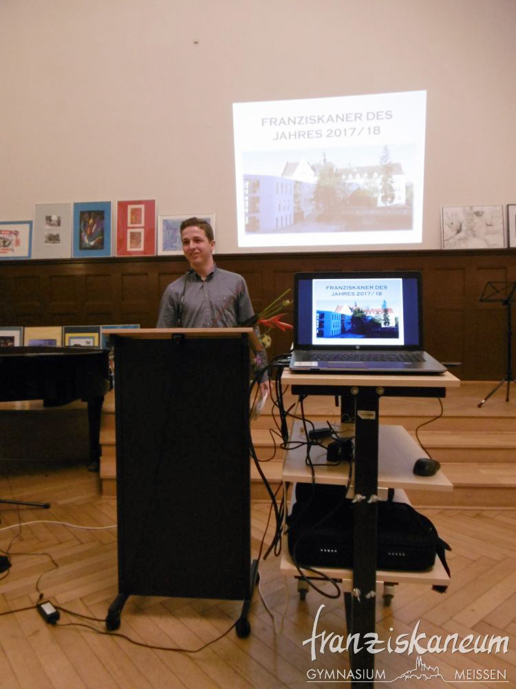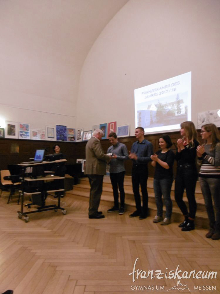 Am Abend des 13.März 2018 wurde zum nunmehr sechsten Mal der Preis „Franziskaner des Jahres“ in der Aula des Franziskaneums Meißen verliehen. Diesen durch den Vorsitzenden des „Vereins zur Förderung des Franziskaneums“, Herrn Uwe Altmann, gestifteten Preis bekommen Schüler oder Lehrer unseres Gymnasiums für besonderes außerunterrichtliches Engagement. Selbst einmal Schüler am heutigen Franziskaneum, möchte Herr Altmann seiner Schule und der Stadt Meißen von Herzen etwas zurückgeben. Drei Nominierte warteten voller Spannung auf die Entscheidung dieses Abends.