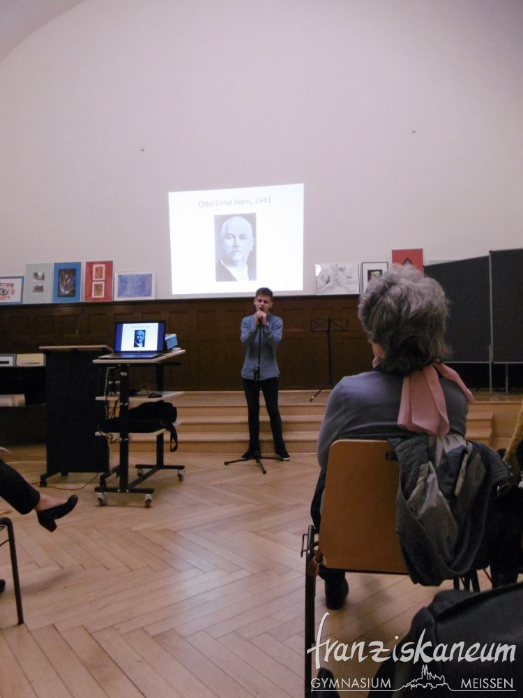 Dies waren die Mitglieder des Schul-Sanitätsdienstes, Niko Kirste, Klasse 11, und Willi Krause, Klasse 12. Die Schulsanitäter stehen seit Jahren mit Kompetenz und Hilfsbereitschaft bei Schulveranstaltungen, Sportfesten oder im Schulalltag bereit, um im Notfall Hilfe zu leisten. Niko entwickelte eine App, die Lehrern und Schülern einen schnellen Einblick gibt, ob der aktuelle Vertretungsplan sie betrifft. Sie wird von 70% aller Franziskaner genutzt und ist für sie nicht mehr wegzudenken. Willi hat die Vergabe der KoL-Themen mit einem selbst entwickelten Computerprogramm revolutioniert. Die letzte Entscheidung über die Vergabe des begehrten Preises trifft die Stifterfamilie. Ehe deren Entscheidung verkündet wurde, durften die Gäste ein würdiges Programm erleben. OB Raschke lobte die Arbeit der Eltern, Lehrer und Schüler am Franziskaneum. Dieses sei nicht nur eine Lehranstalt, sondern eine Gemeinschaft – über das selbstverständliche Maß hinaus. Gastredner Herr Lauerwald sprach über Otto Ernst Horn und dessen Stiftung und die Laudatoren priesen überzeugend die besonderen Verdienste der Nominierten. Jeder hätte den Preis verdient!