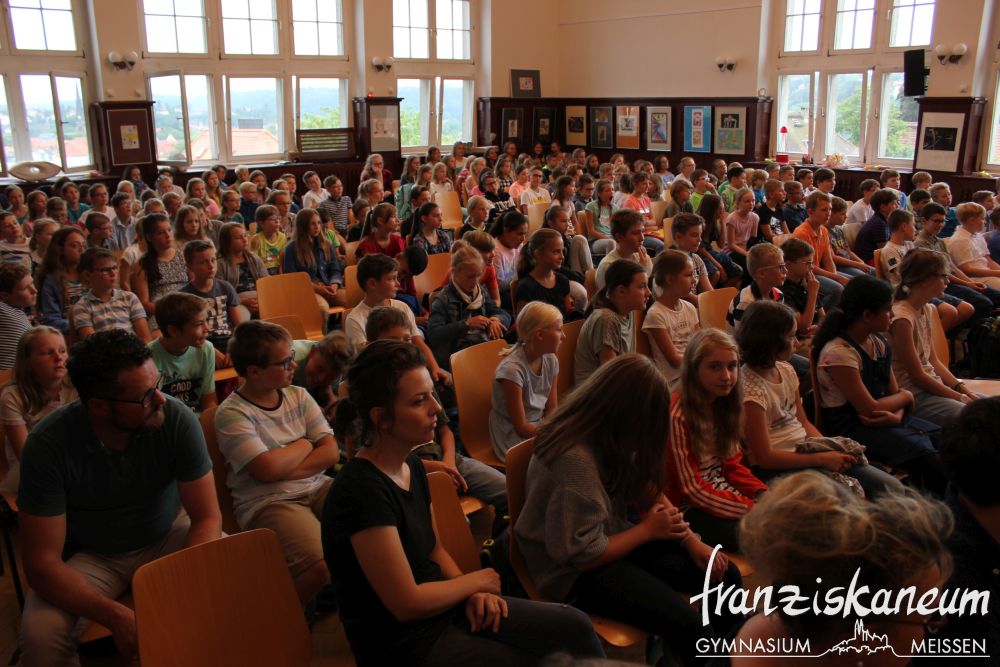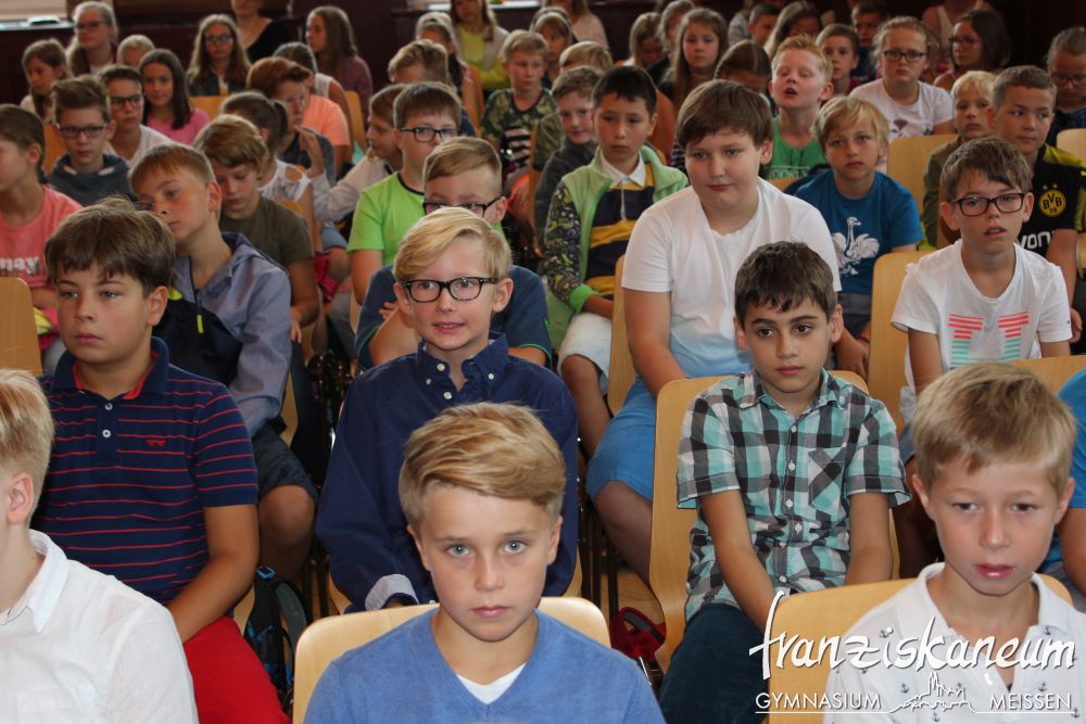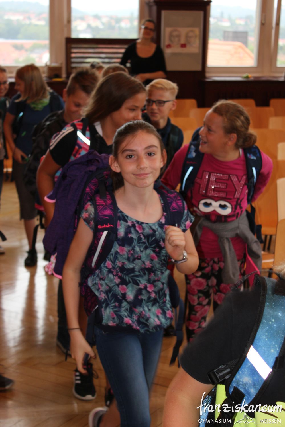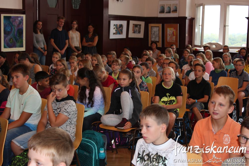Auch in diesem Schuljahr durften wir wieder sechs neue fünfte Klassen mit insgesamt 157 Schülern an unserer Schule begrüßen. Die Tradition, dass die Schüler der 12. Klasse die „Kleinen“ in Empfang nehmen und gemeinsam festlich in die Aula einziehen, wurde auch dieses Jahr beibehalten. Hier wurden sie herzlichst von der Schulleitung, ihren Klassenlehrern sowie ihren Patenklassen und Bürgermeister Markus Renner, als Vertreter der Stadt, begrüßt.