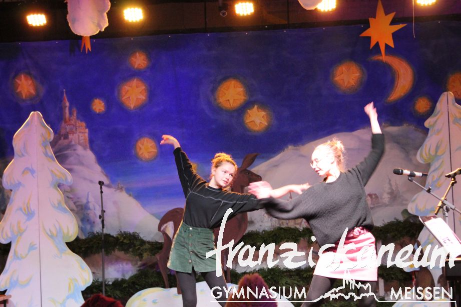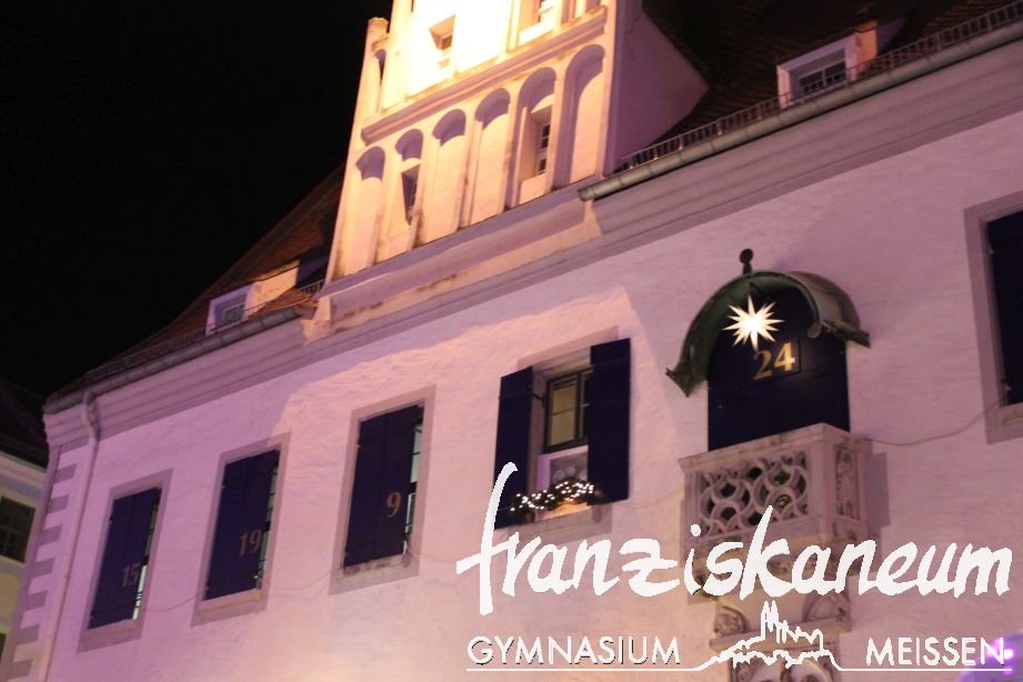 Schon seit vielen Jahren gibt es auf dem Meißner Weihnachtsmarkt eine schöne Tradition: Jeden Abend öffnet sich ein Türchen des Adventskalenders am historischen Rathaus. Dies erfolgt stets mit einer kleinen kulturellen Umrahmung auf der angrenzenden Bühne. Am 3.12.2019 konnte man das Programm der Musikkurse des Abiturjahrganges des Franziskaneums erleben, welches neben traditionellen Weihnachtsliedern (u. a. „Tausend Sterne sind ein Dom“ von Siegfried Köhler, einem ehemaligen Schüler unseres Gymnasiums), Solodarbietungen auch eine tänzerische Choreographie beinhaltete. Die im Anschluss eingesammelten Spenden kommen der Finanzierung der Abiturfeier zugute.