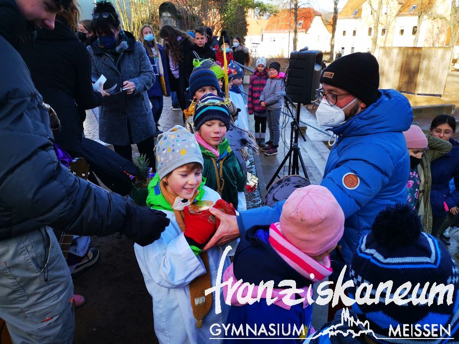 Am 20.01.2022 besuchten uns die Sternsinger aus dem Franziskus-Kinderhaus. Auf der zweiten Hofpause stimmten sie einige Lieder an, stellten uns ihr Spendenanliegen für die Sternsingeraktion 2022 vor und segneten mit den Sprüchen der Drei Könige unsere Schule. Die Kinder des Franziskus-Kinderhauses danken der Schulgemeinschaft für Spenden in Höhe von insgesamt 200 EUR. Wir haben uns mit zwei großen Obstkörben für den fröhlichen Besuch bedankt.