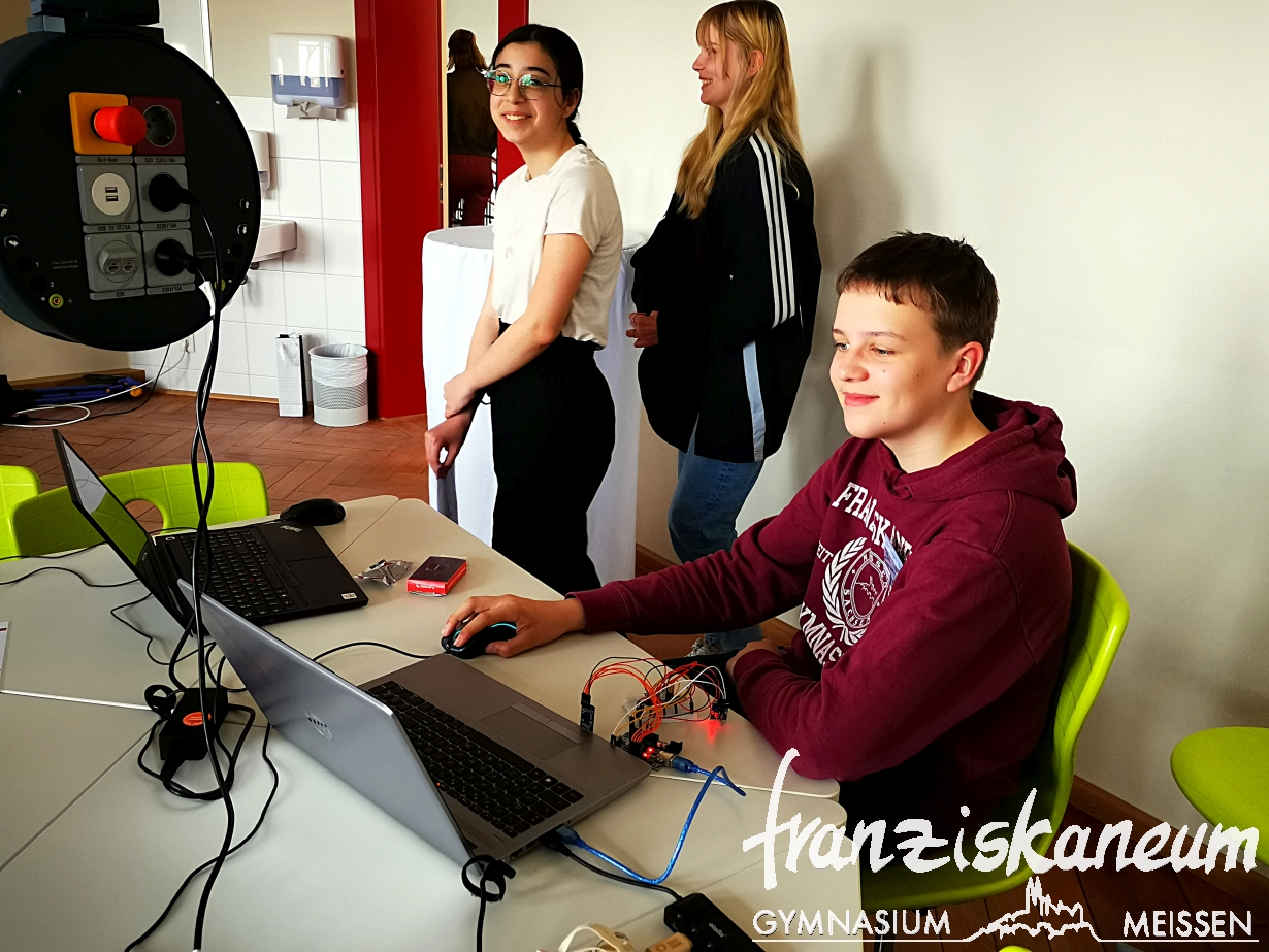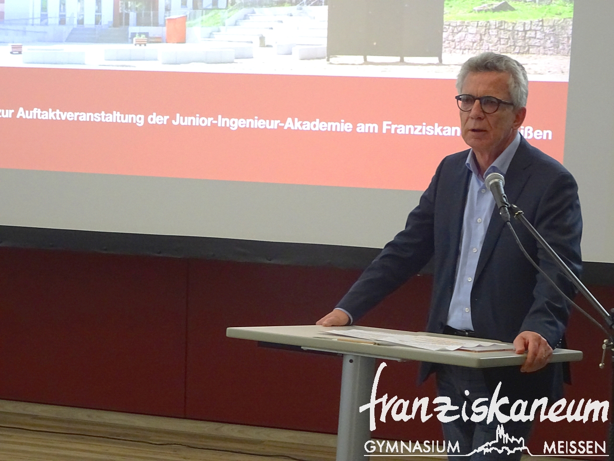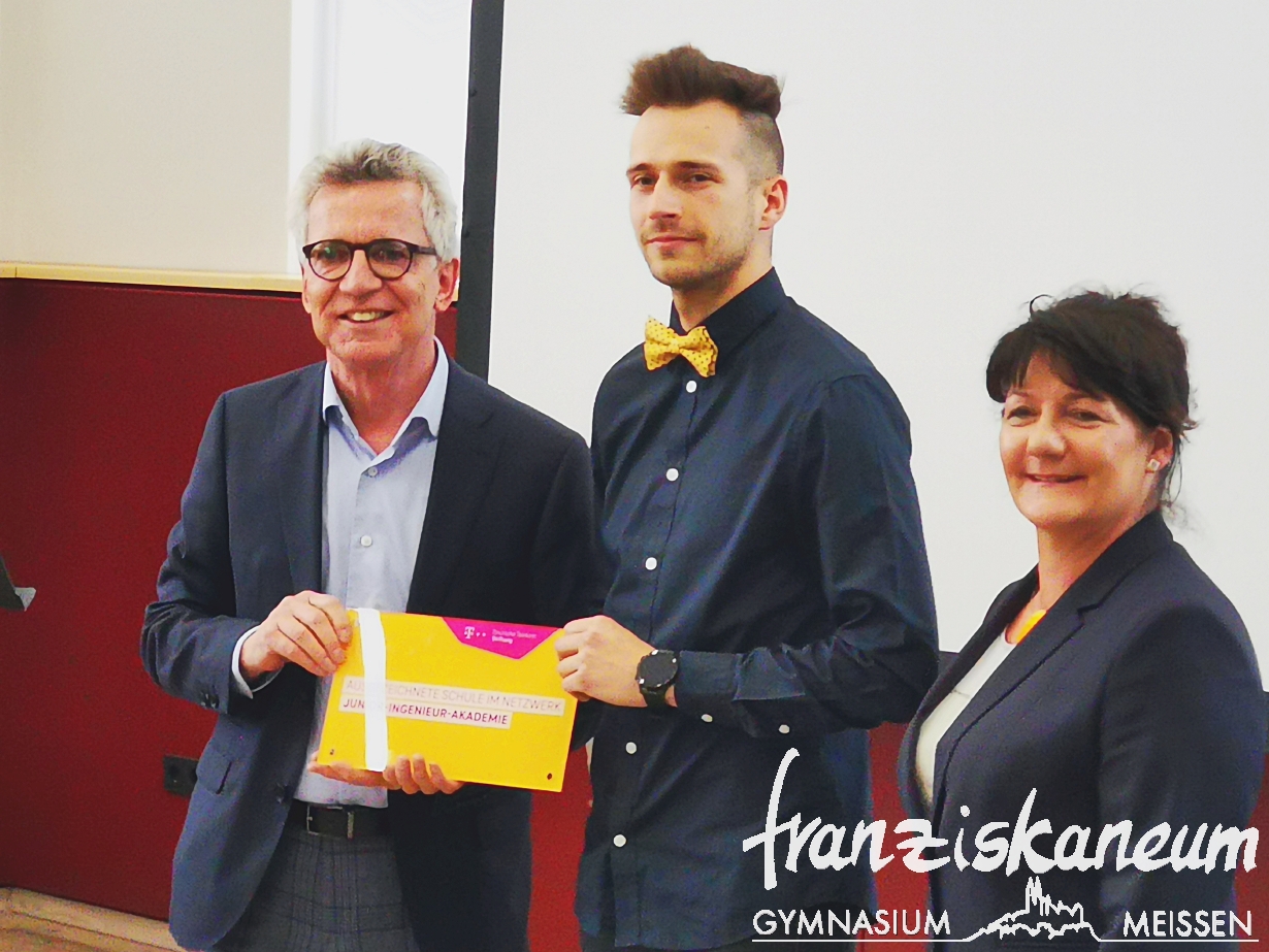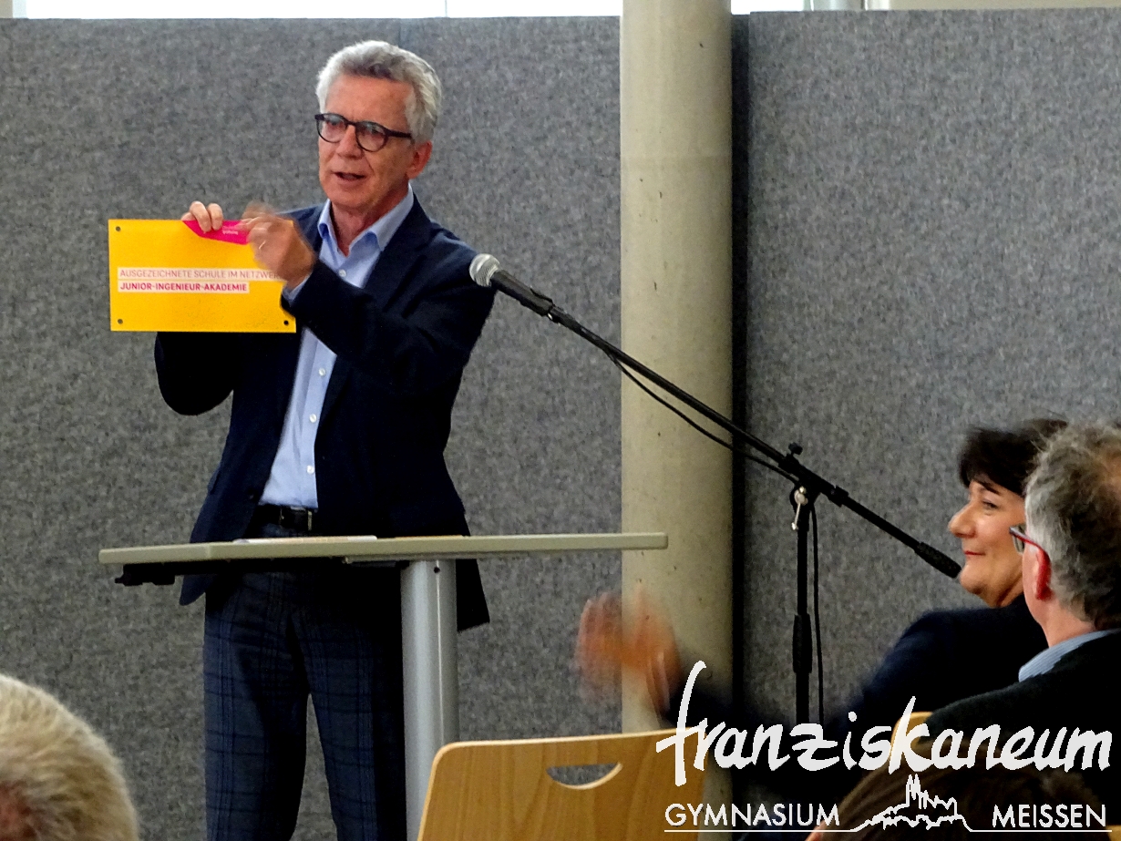 Seit dem Schuljahr 2021/22 gehört das Franziskaneum zu einer von deutschlandweit 100 Schulen, an der die Junior-Ingenieur-Akademie (JIA) angesiedelt ist. Das von der Telekom-Stiftung entwickelte Programm dient dazu, Schulen dabei zu unterstützen, junge Menschen für naturwissenschaftliche Berufe zu begeistern. Am Mittwoch, dem 4.05.2022, wurde nun die JIA am Franziskaneum (pandemiebedingt) nachträglich eröffnet. Geladen waren u. a. Stiftungsvorsitzender Thomas de Maizière, Oberbürgermeister Olaf Raschke sowie Lehrer und Schüler.
