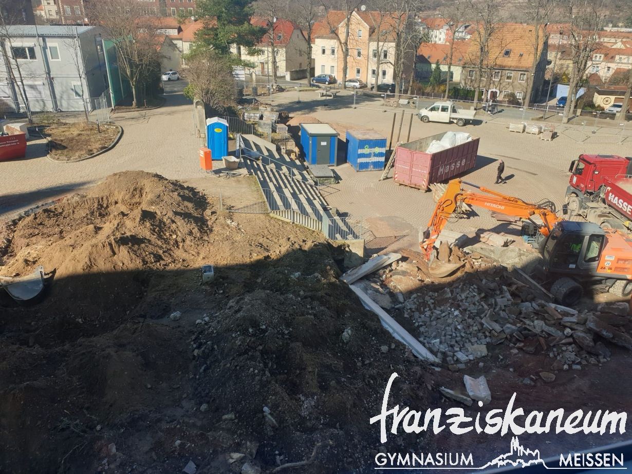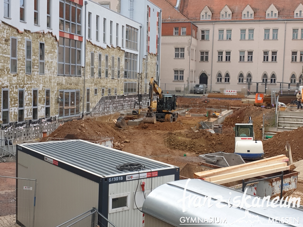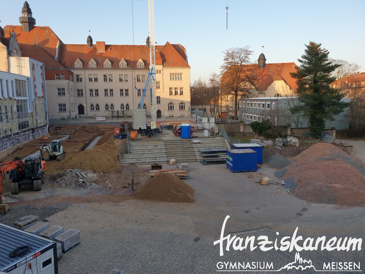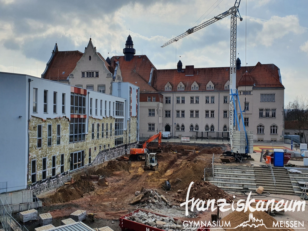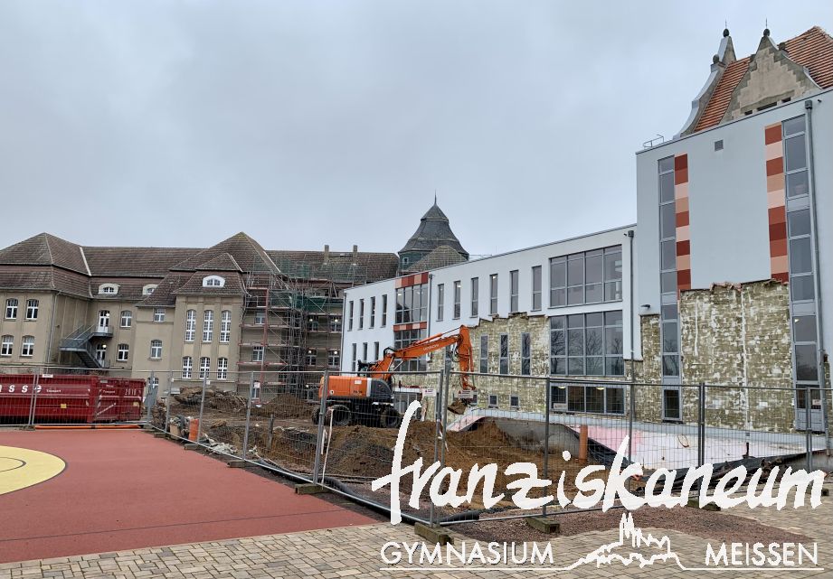 Seit den Winterferien 2022 ist auf dem Schulhof des Franziskaneums erneut eine Baustelle entstanden. Der Verbinderbau (B-Gebäude/Hauptgebäude) soll erweitert werden, so dass die Mensa ihre Platzkapazität mehr als verdoppeln kann. Weiterhin sollen in den oberen Etagen Fachkabinette für Physik, Chemie und Biologie entstehen. Hier wird das Baugeschehen in Bildern dokumentiert.