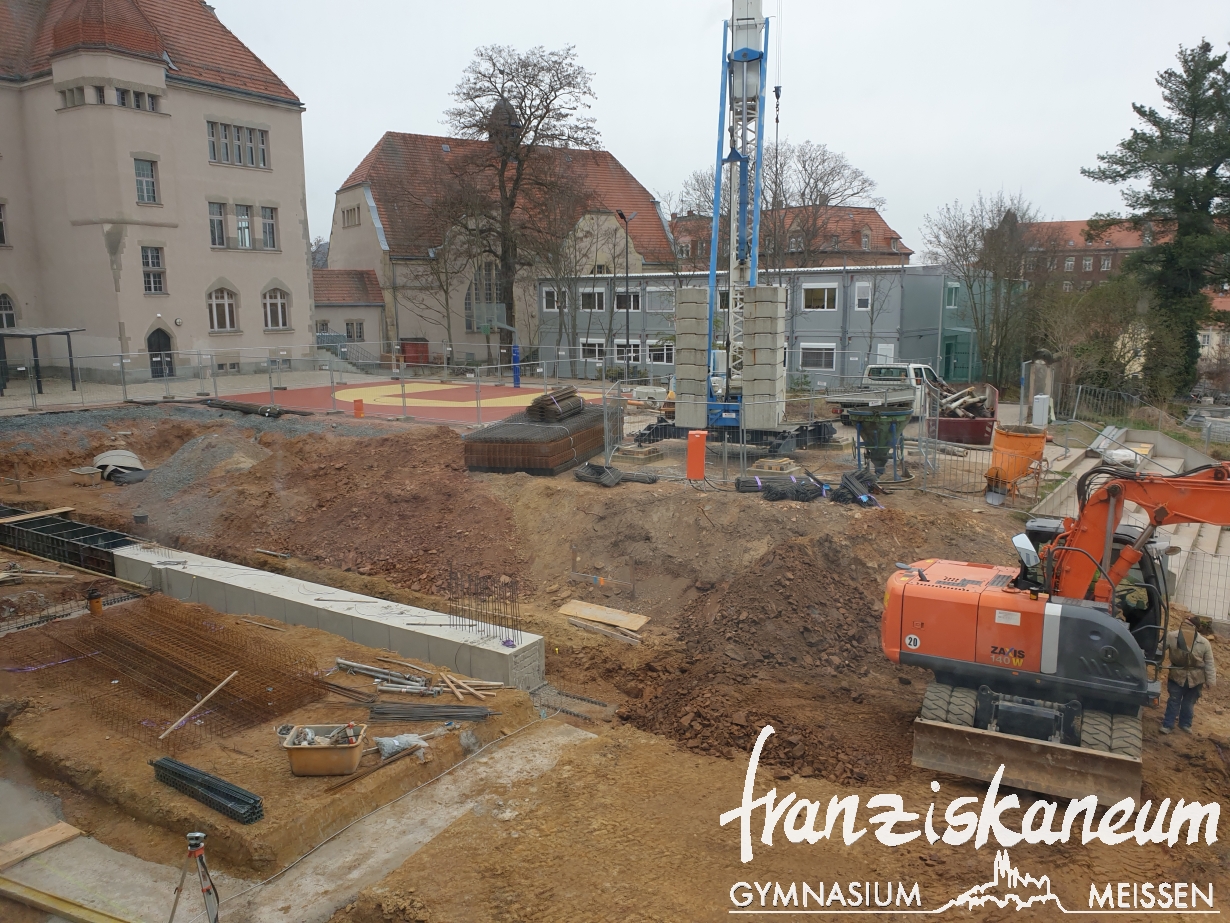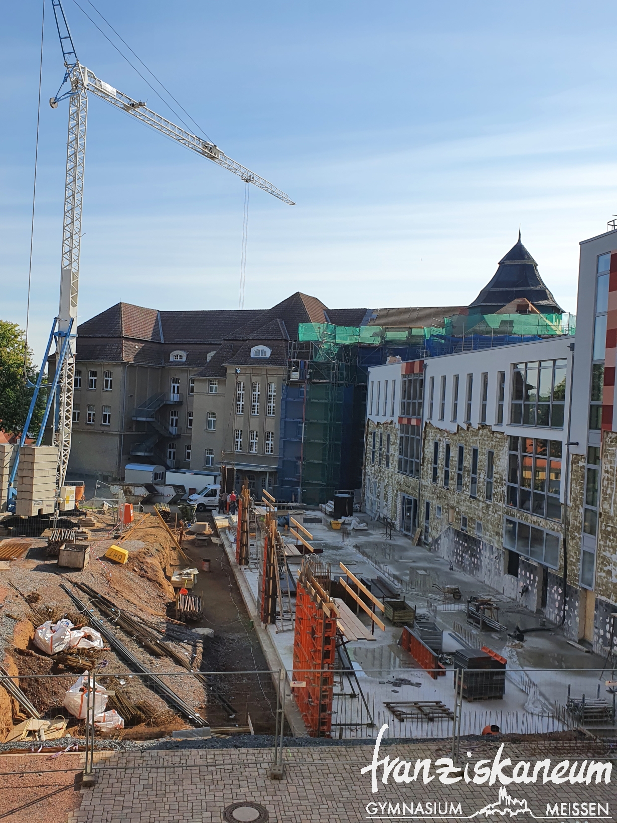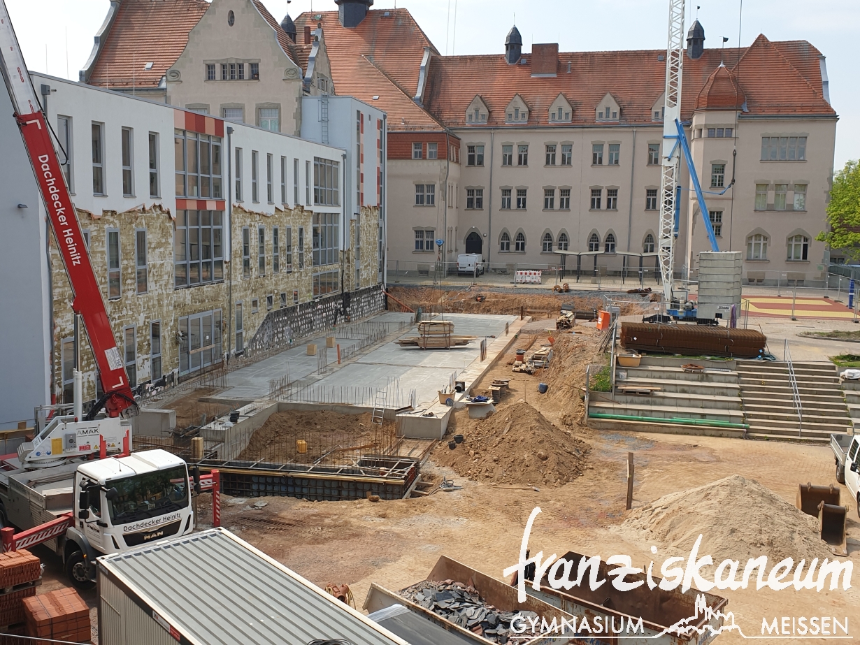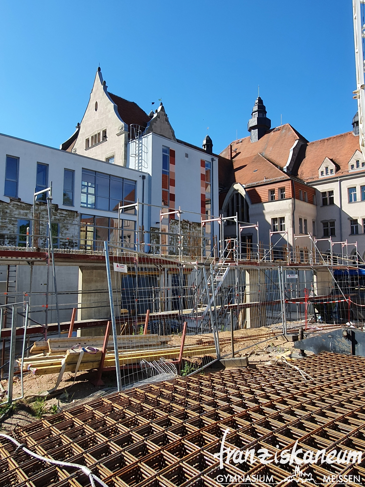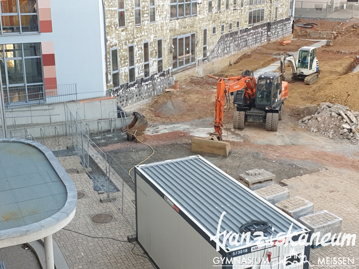 Seit den Winterferien 2022 ist auf dem Schulhof des Franziskaneums erneut eine Baustelle entstanden. Der Verbinderbau (B-Gebäude/Hauptgebäude) soll erweitert werden, so dass die Mensa ihre Platzkapazität mehr als verdoppeln kann. Weiterhin sollen in den oberen Etagen Fachkabinette für Physik, Chemie und Biologie entstehen. Hier wird das Baugeschehen in Bildern dokumentiert.