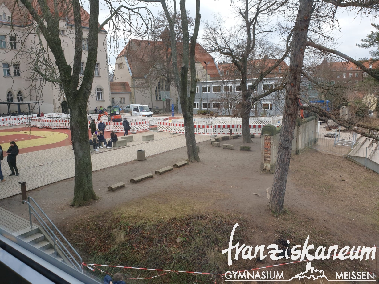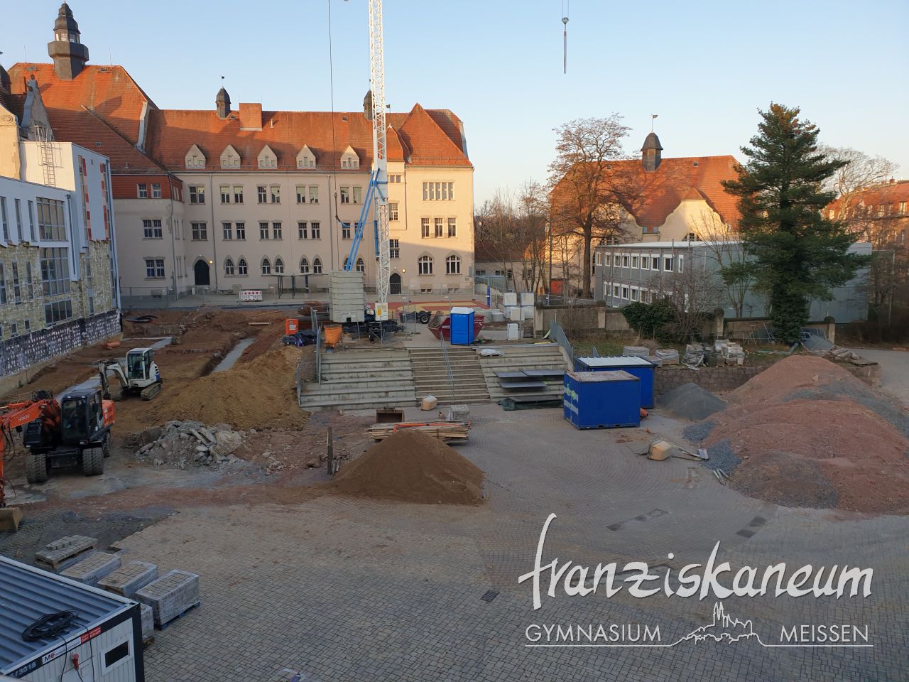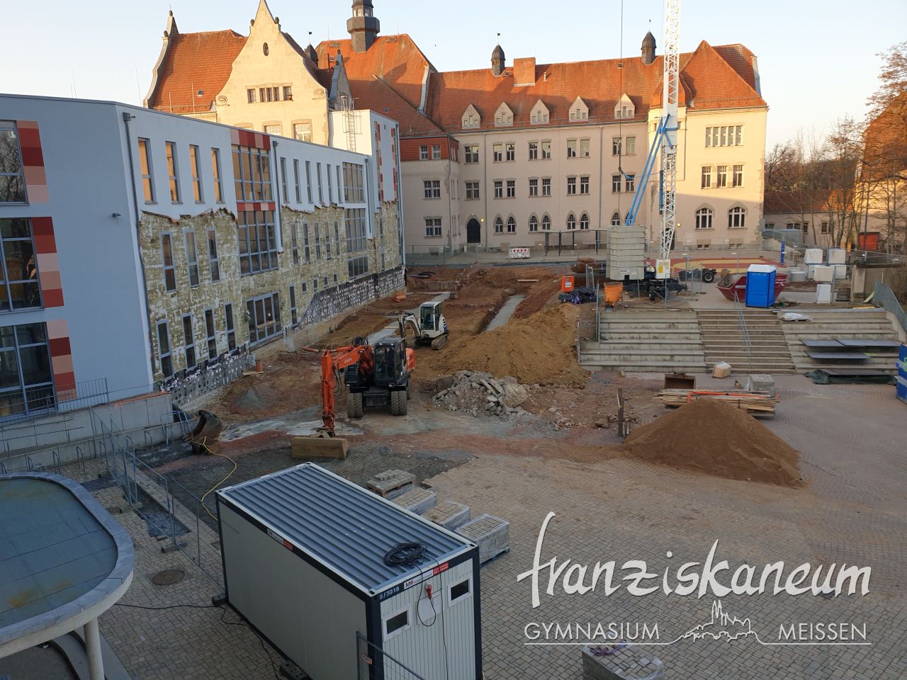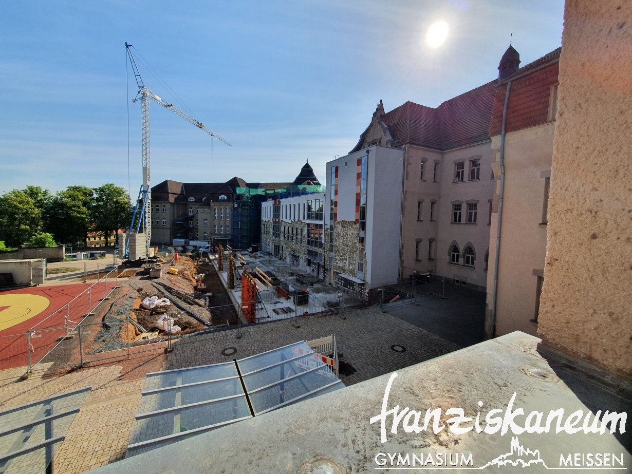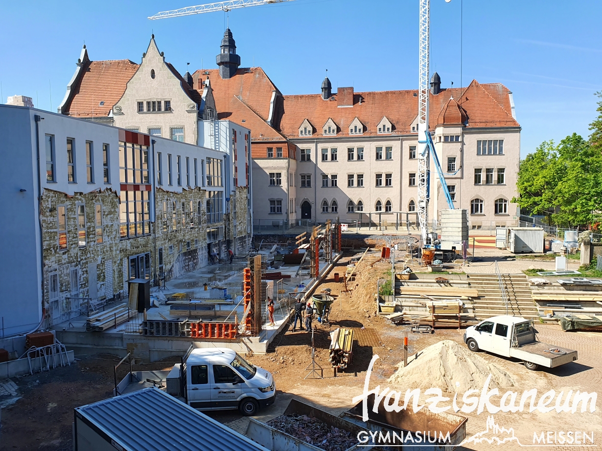 Seit den Winterferien 2022 ist auf dem Schulhof des Franziskaneums erneut eine Baustelle entstanden. Der Verbinderbau (B-Gebäude/Hauptgebäude) soll erweitert werden, so dass die Mensa ihre Platzkapazität mehr als verdoppeln kann. Weiterhin sollen in den oberen Etagen Fachkabinette für Physik, Chemie und Biologie entstehen. Hier wird das Baugeschehen in Bildern dokumentiert.