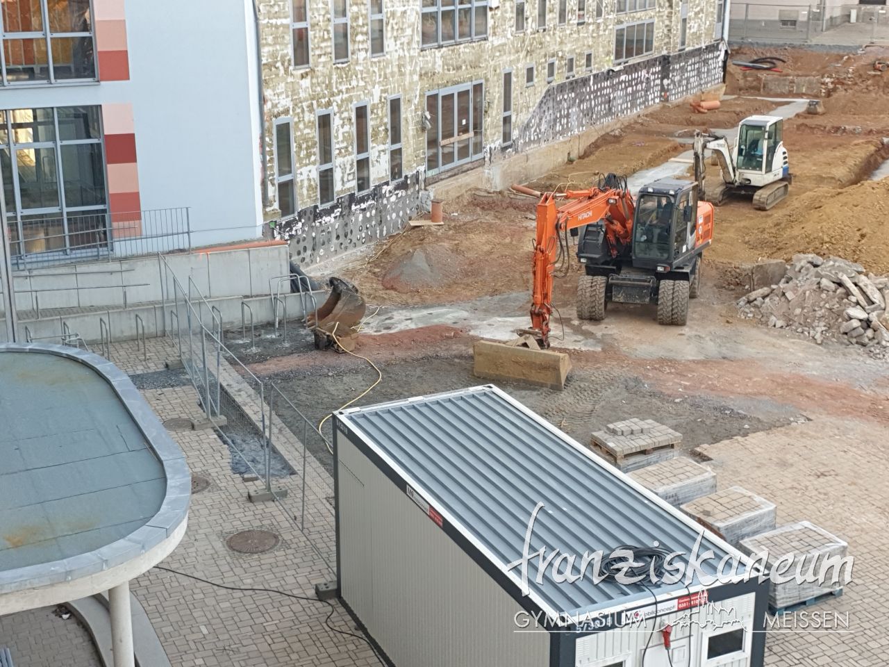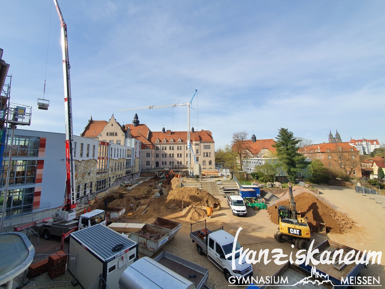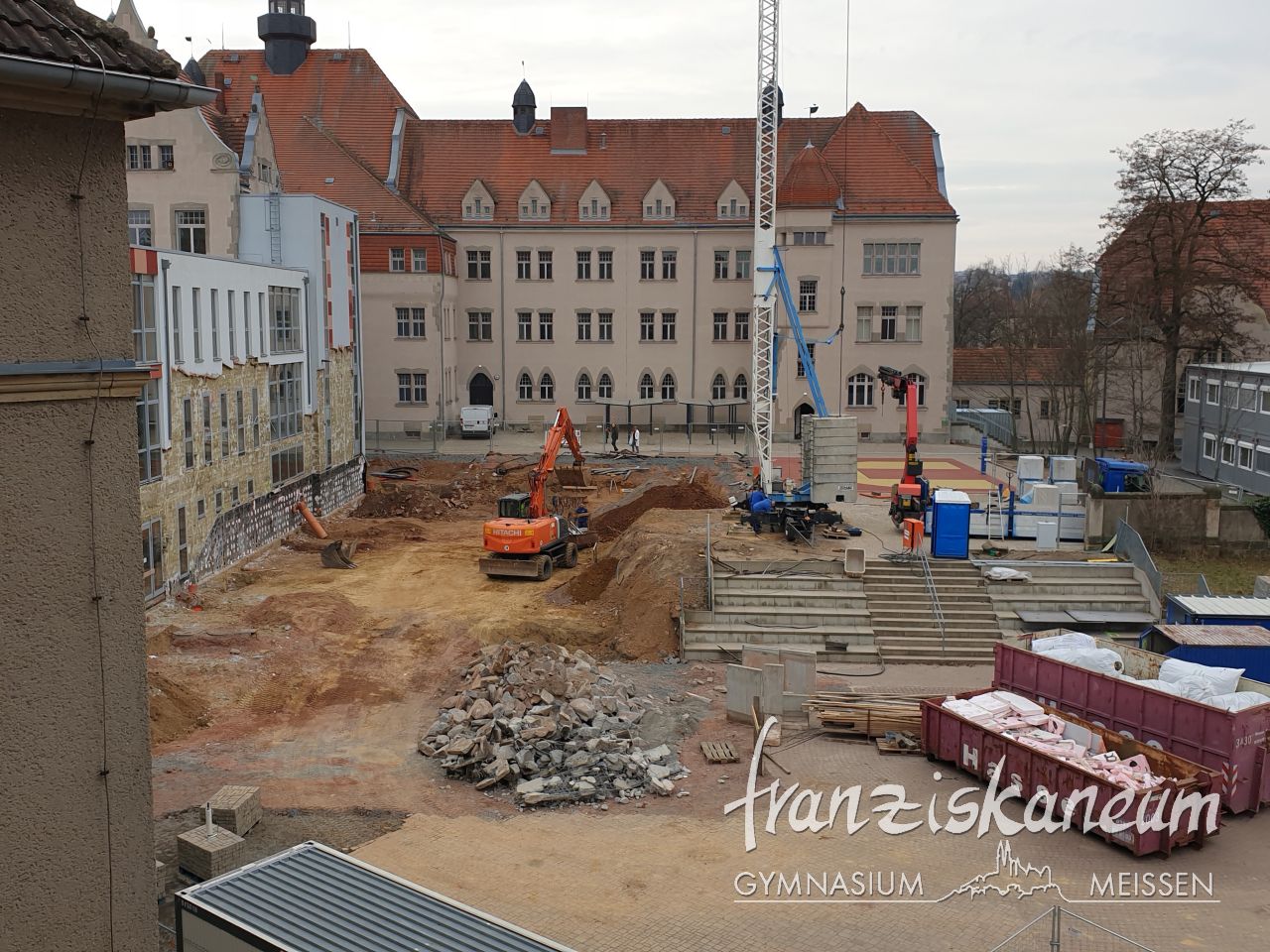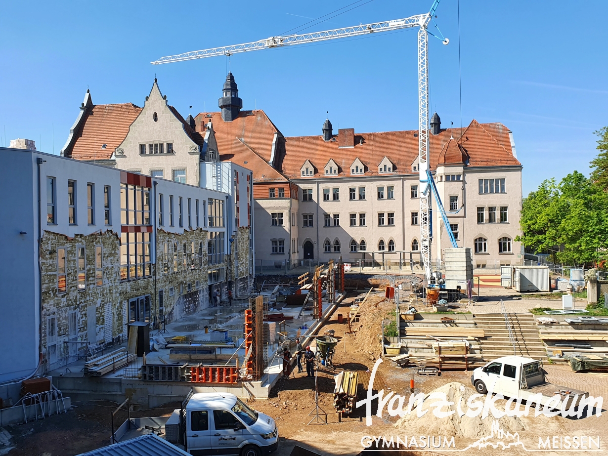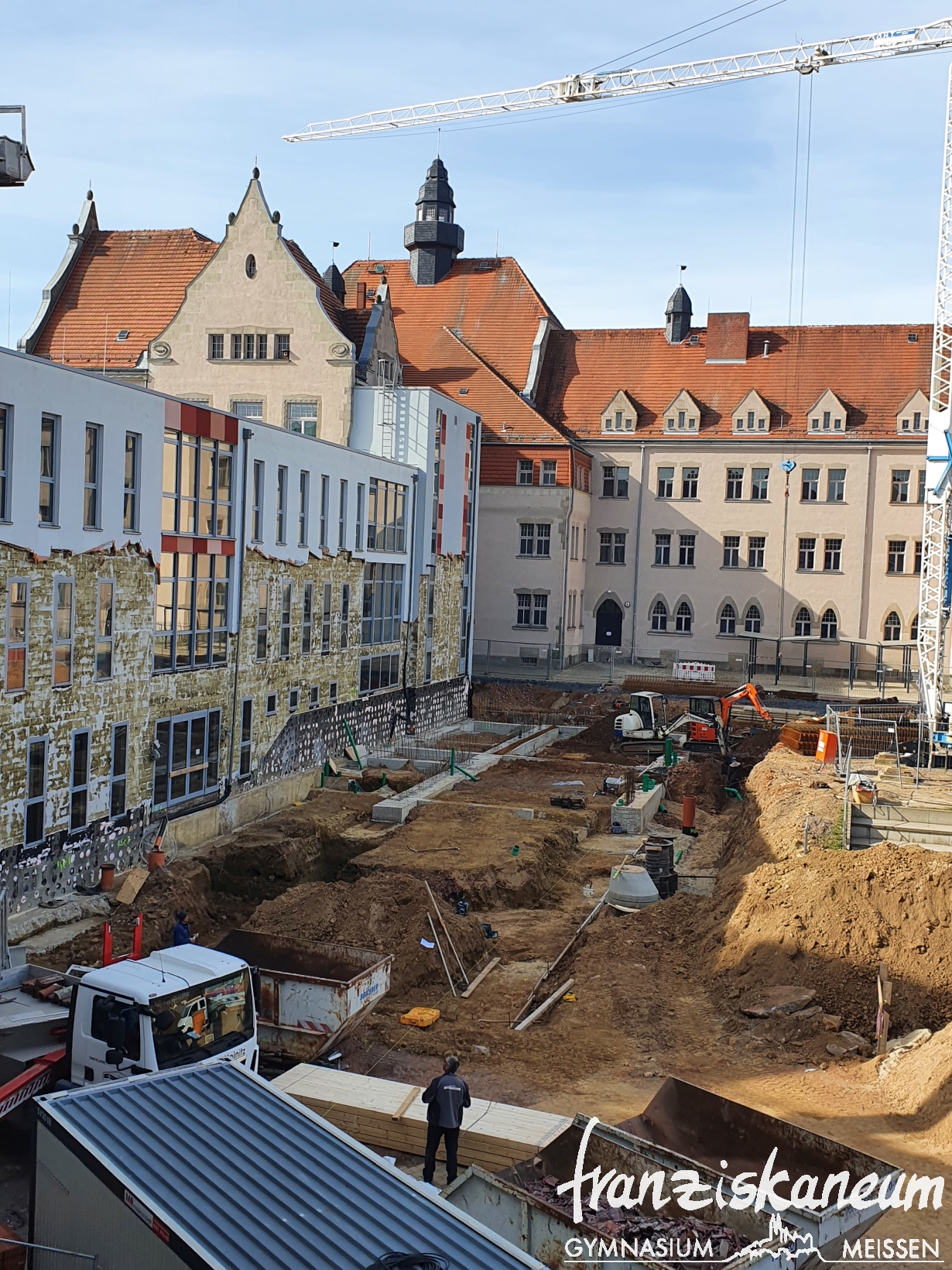 Seit den Winterferien 2022 ist auf dem Schulhof des Franziskaneums erneut eine Baustelle entstanden. Der Verbinderbau (B-Gebäude/Hauptgebäude) soll erweitert werden, so dass die Mensa ihre Platzkapazität mehr als verdoppeln kann. Weiterhin sollen in den oberen Etagen Fachkabinette für Physik, Chemie und Biologie entstehen. Hier wird das Baugeschehen in Bildern dokumentiert.
