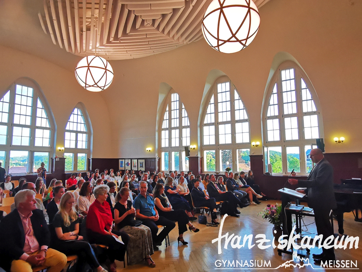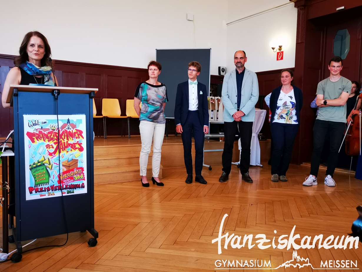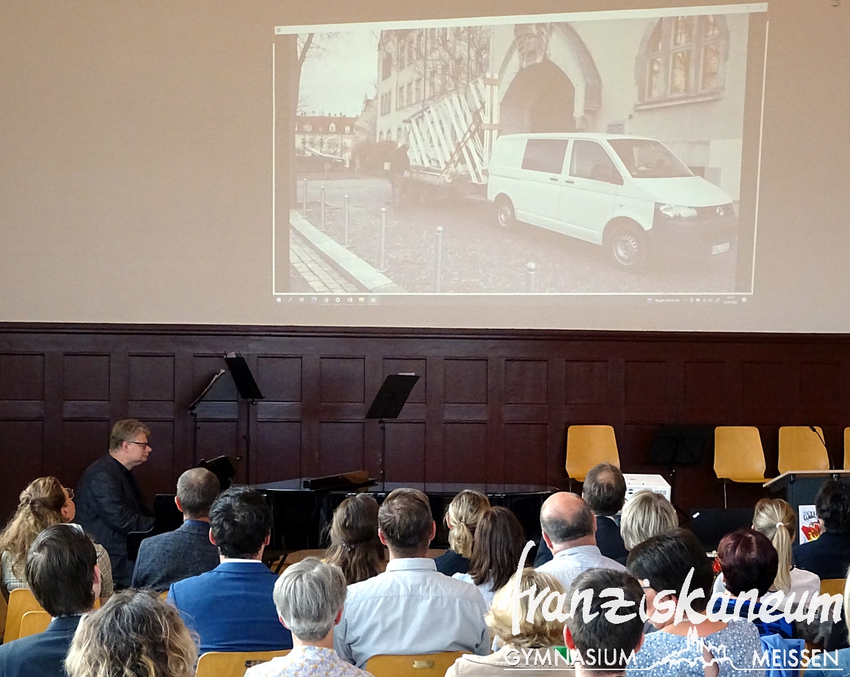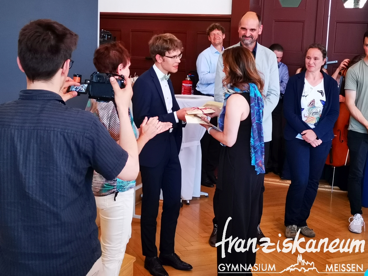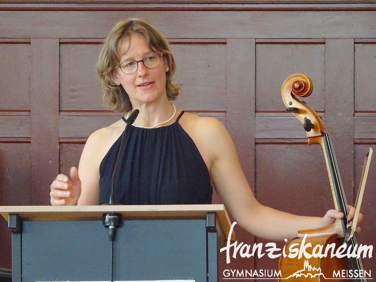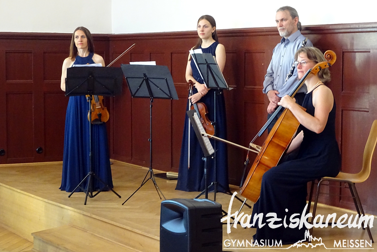 Das Ensemble „FOURtissimo“, mit Sandra Bohrig (Violoncello) Susanne Knappe (Violine) Roland Vetters (Klarinette), Holger Miersch (Klavier) und als besonderer Gast Julia Knappe an der Violine, Schülerin des Musikgymnasium Dresden begeisterten das Publikum mit einer musikalischen Weltreise. Werke von Jean Sibelius, Johannes Brahms, Henryk Wieniawski …. und die Vielfalt der Darbietungen, besonders die Stücke mit der 16-jährigen Geigerin Julia Knappe boten einen würdigen Rahmen für die Einweihung der Akustik -Decke und der Prämierung des Franziskaners des Jahres 2021.