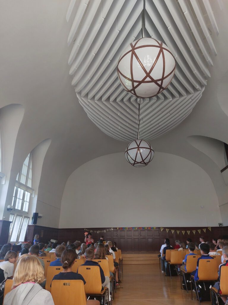 Die Aufnahmefeier am 11. August 2025 begann schon vor dem Haupteingang. Traditionell versammelten sich die neuen Schüler bei ihren Klassenleitern vor der Tür, um von den Abiturienten in die Aula geführt zu werden. Dort angekommen, wurden alle Stühle besetzt und das Programm musikalisch durch die Klasse 2024-1 unter der Leitung von Herrn Grau eröffnet. Anschließend richtete Frau Zimmer einige Worte an die neuen Fünftklässler und ließ die Wünsche und Ziele – Mut, Fairness, Kreativität, Zusammenhalt, Geduld und Neugier – für die Klassen von mutigen Schülern verlesen. Einen theatralischen Beitrag lieferten die Kreativen Franziskaner. Danach kam Bürgermeister Markus Renner noch zu Wort, um ebenfalls seine Wünsche an die neuen Schüler zu richten. Das Programm endete mit der Zuordnung nach Klassen, sodass sich die Aula schrittweise und jeweils im Klassenverband leerte.