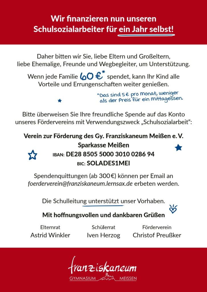 Für das Jahr 2026 benötigen wir 60.000 Euro, was etwa 5 Euro pro Monat und Schüler entspricht. Wenn es uns gelingt, dieses eine Jahr selbst zu finanzieren, steigen die Chancen erheblich, Schulsozialarbeit am Franziskaneum dauerhaft zu sichern.